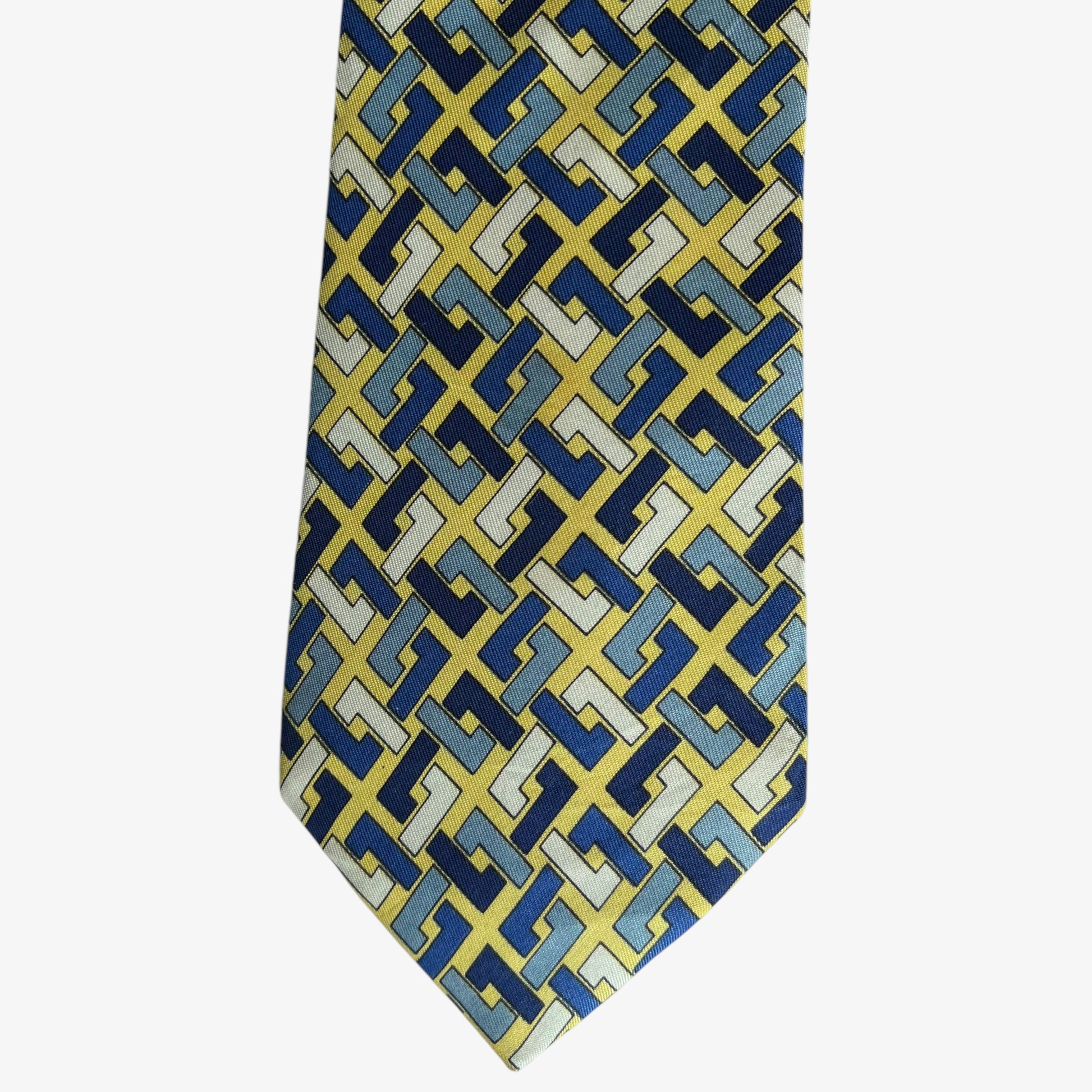 Vintage 90s Turnbull And Asser Blue Abstract Print Yellow Silk Tie.