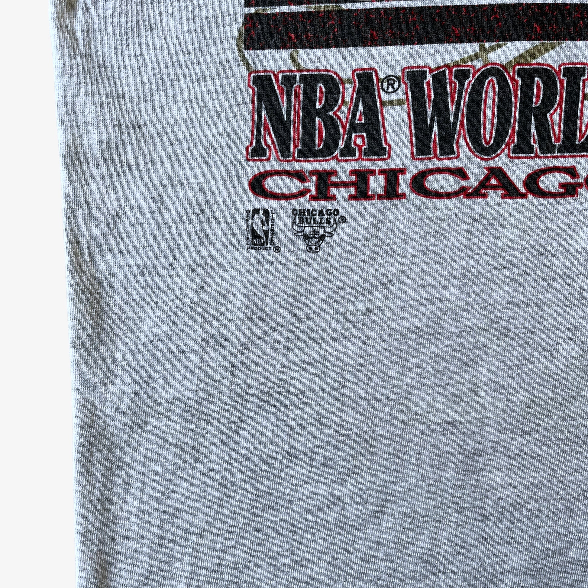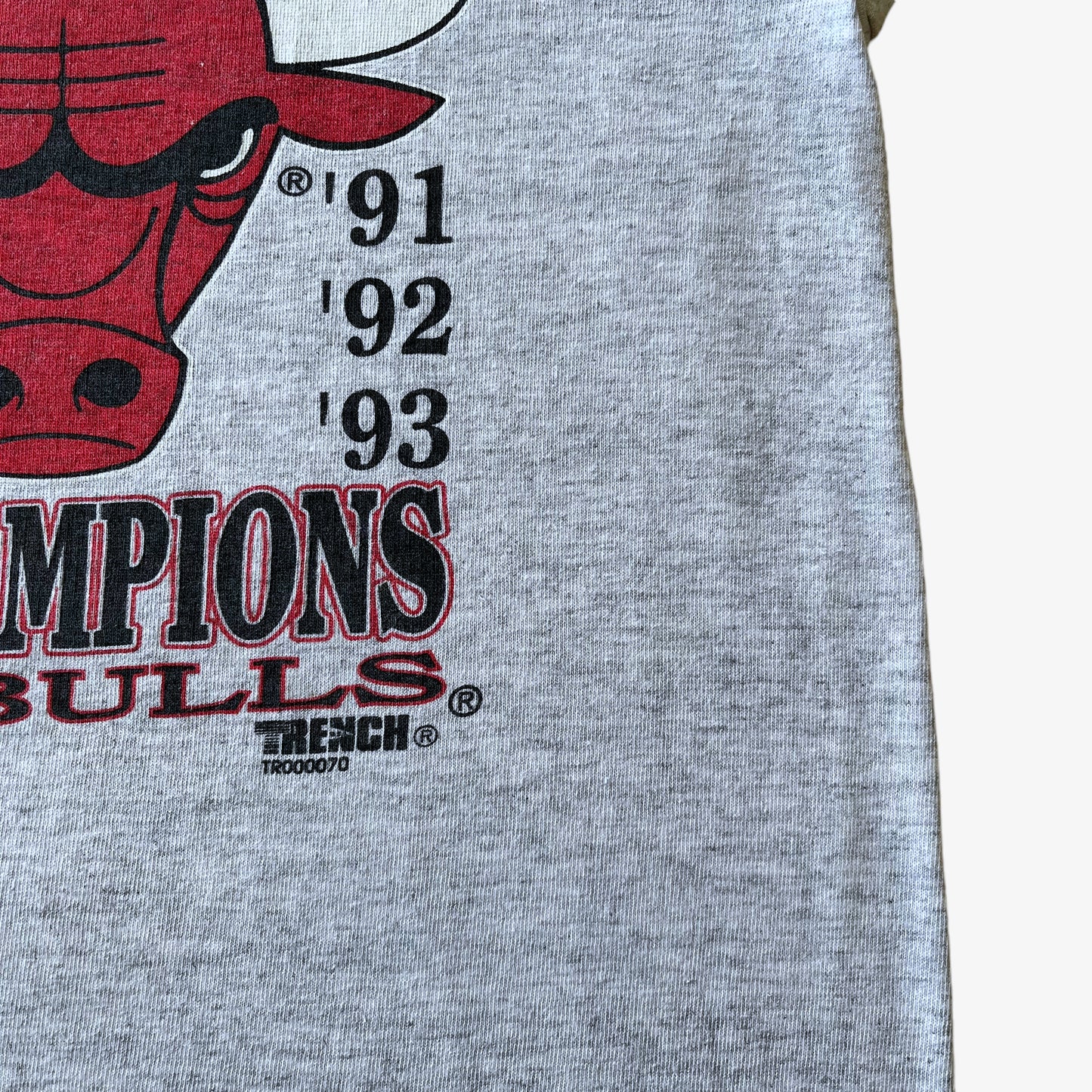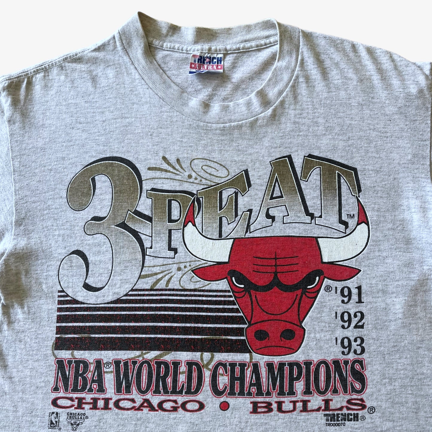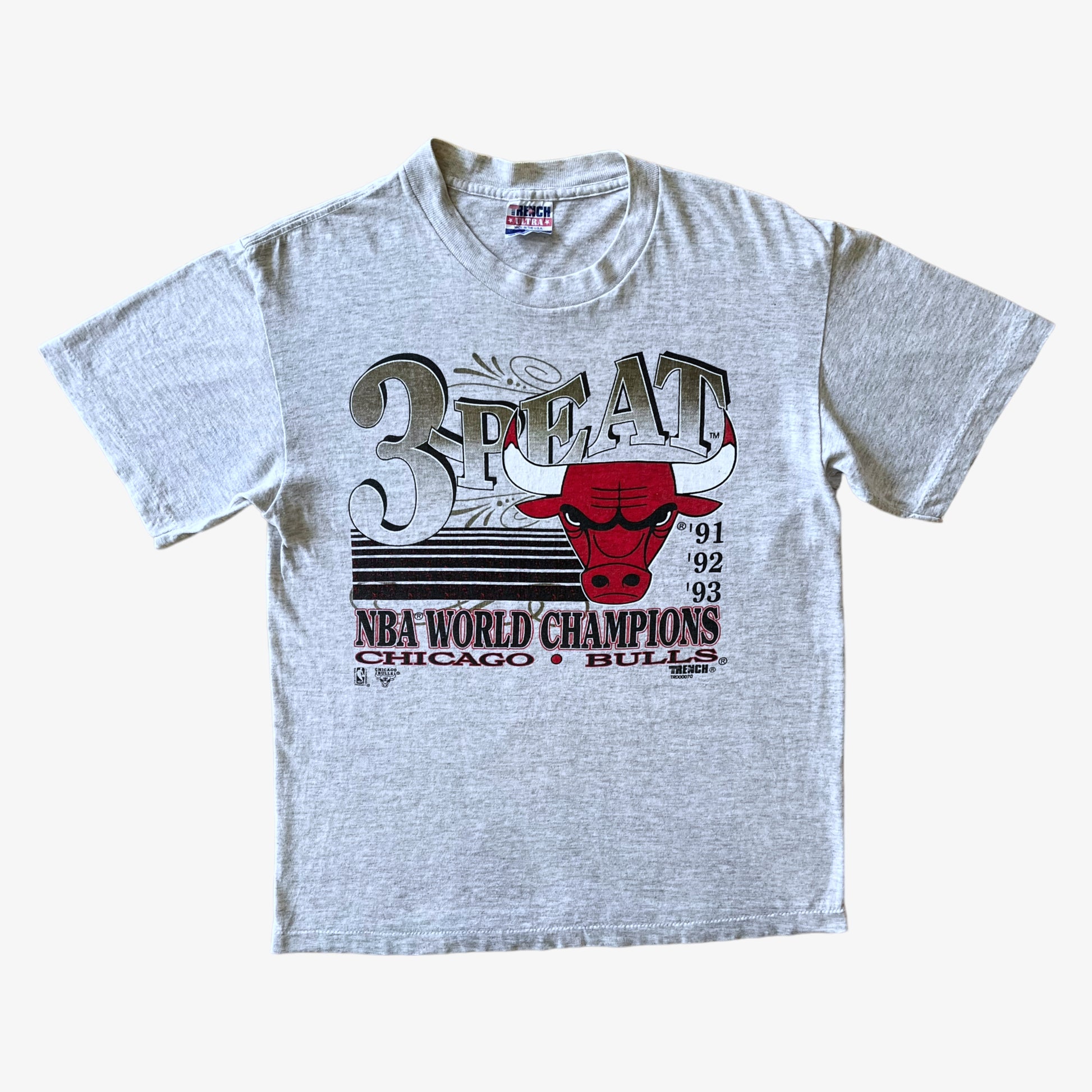 Vintage 90s Men's Trench Ultra 1993 Chicago Bulls Basketball Team 3-Peat Single Stitch Grey T-Shirt.