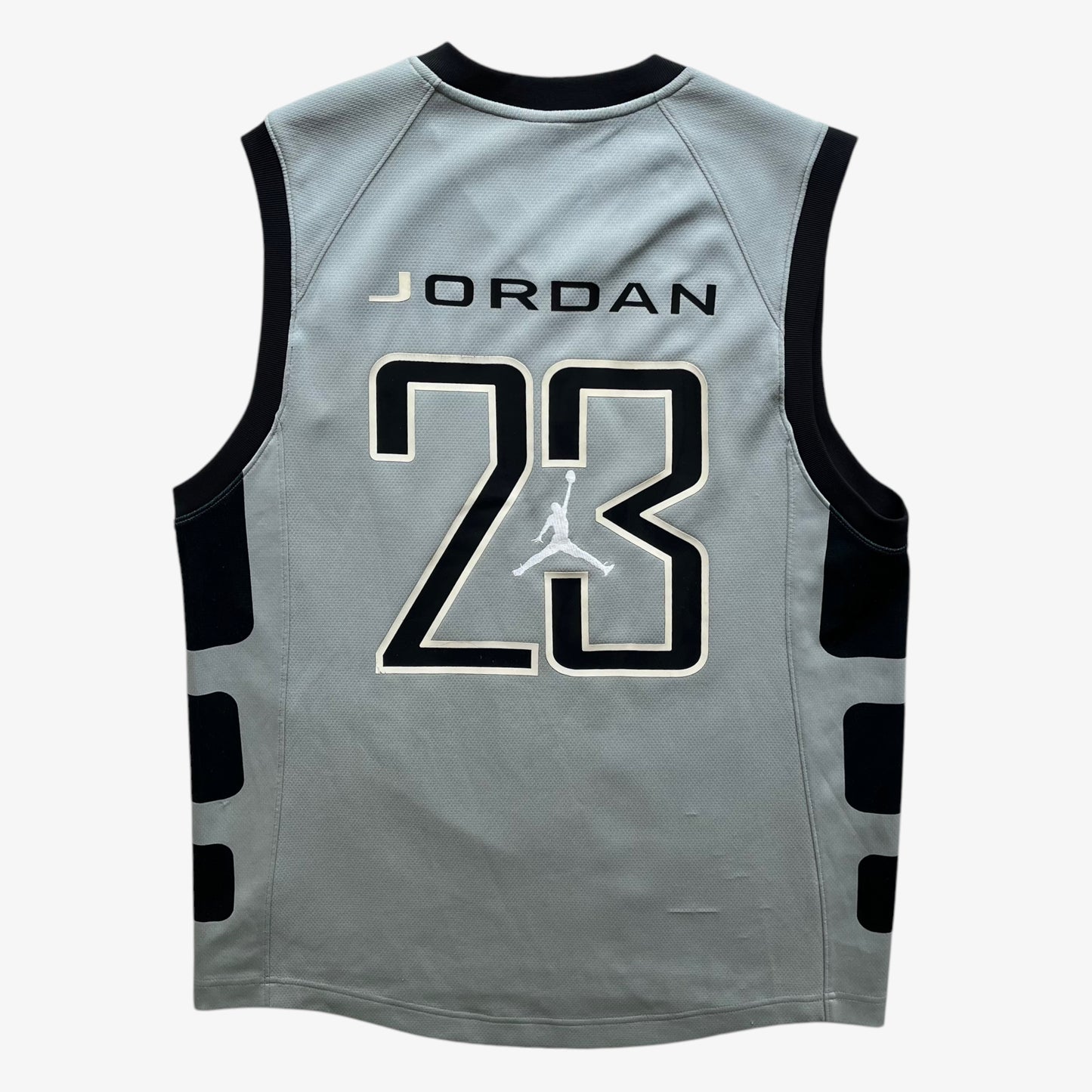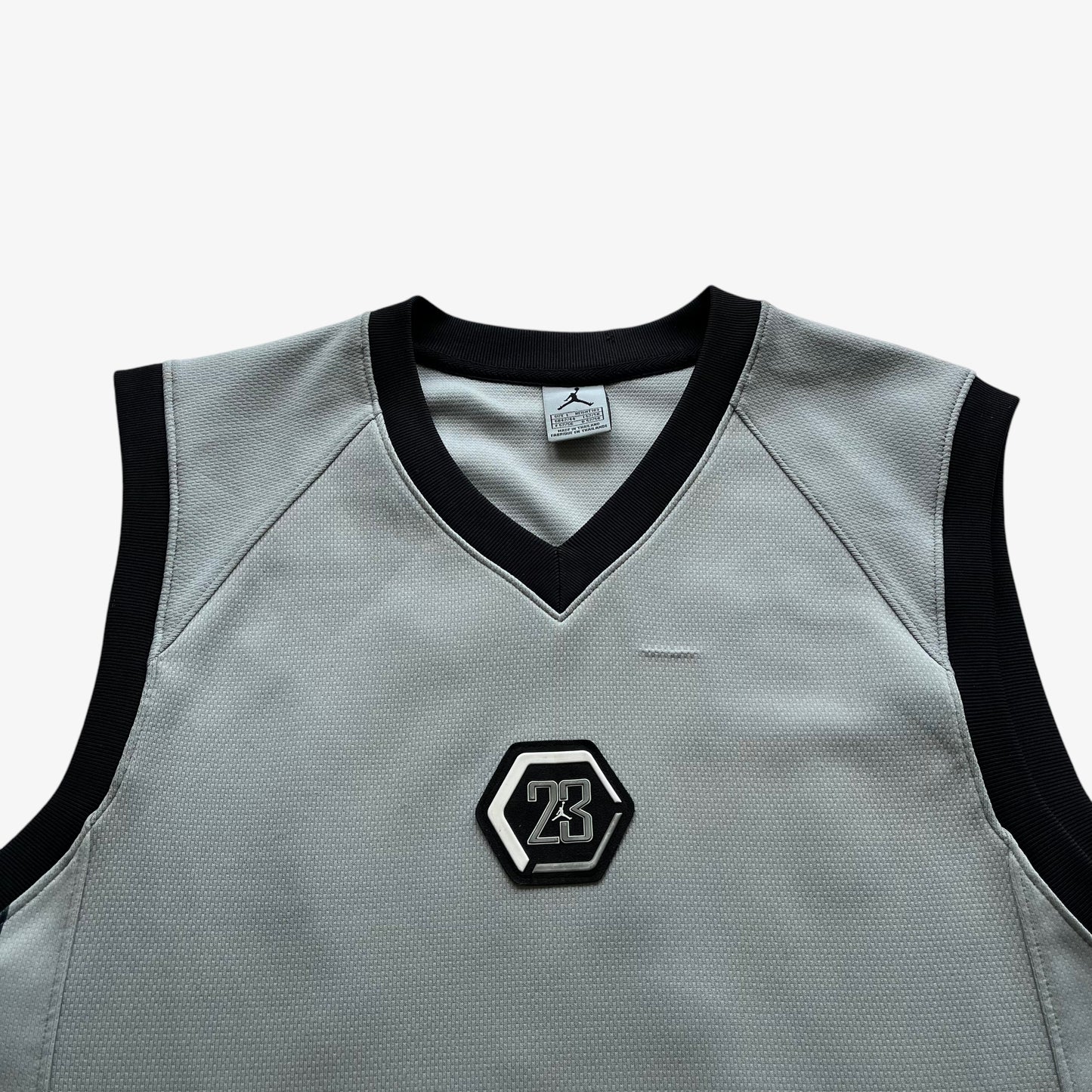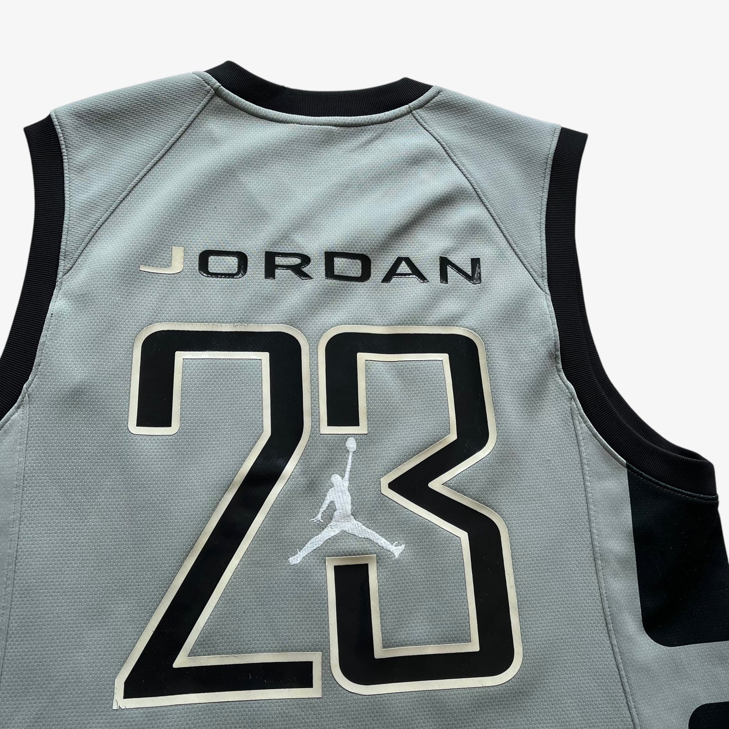 Vintage 90s Men's Michael Jordan 23 Jumpman Grey And Black Basketball Jersey.