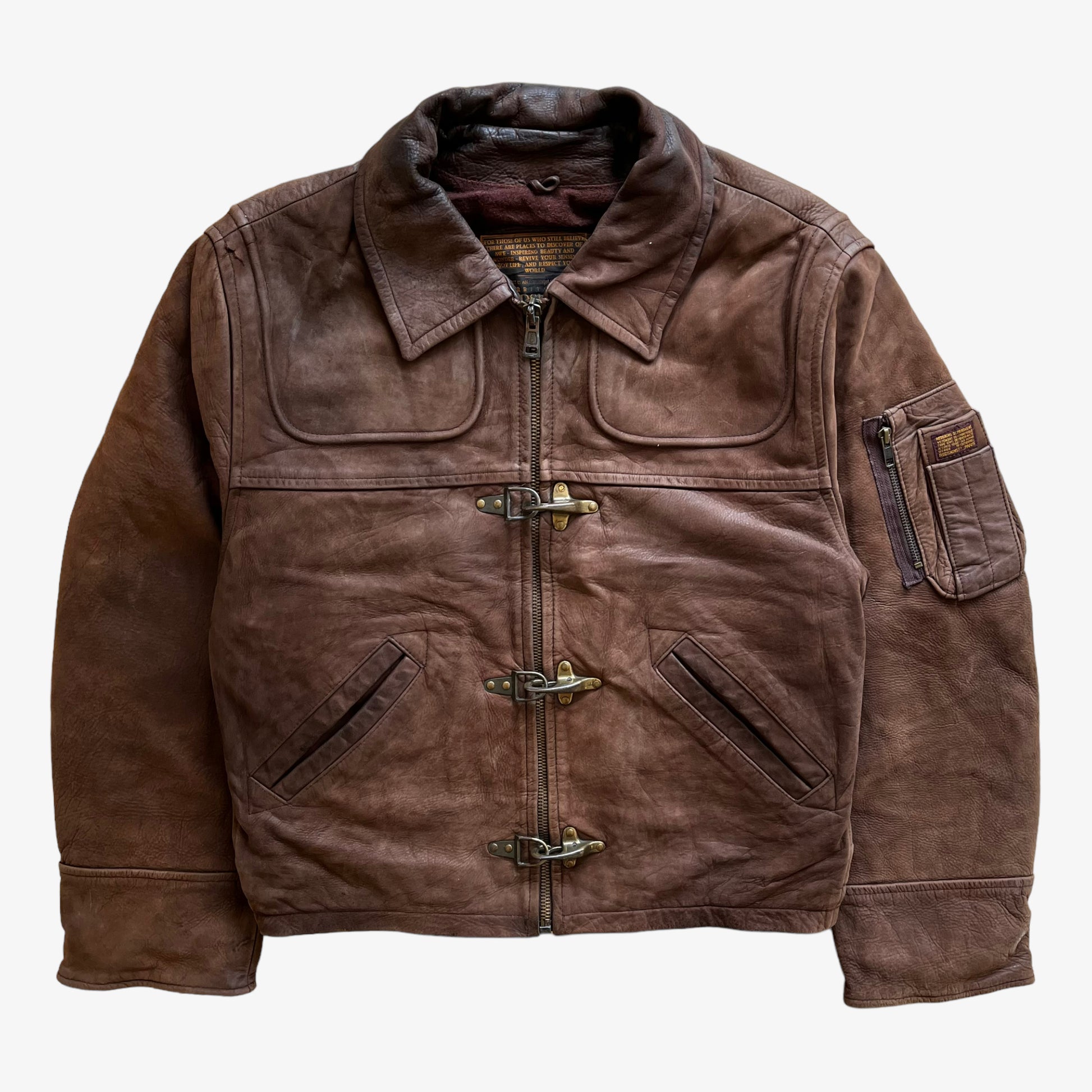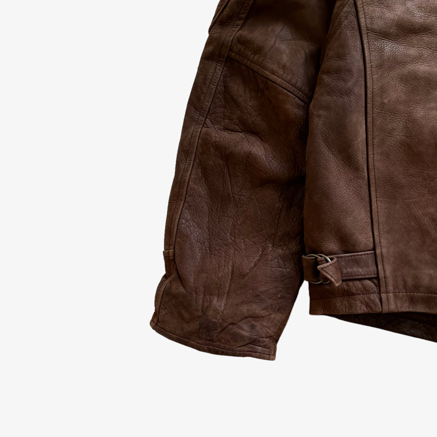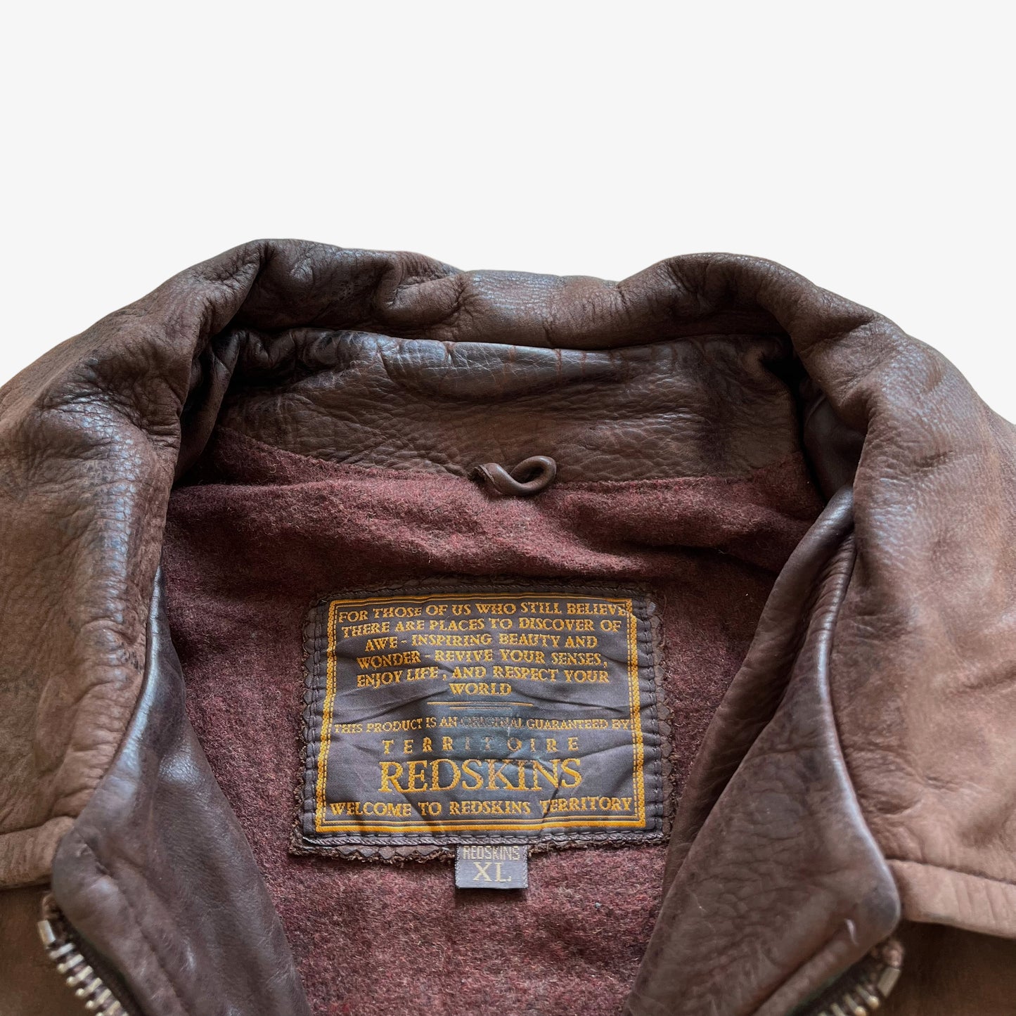 Vintage 90s Men's Redskins Territoire Brown Leather Pilot Jacket With Fish Hook Fasteners.