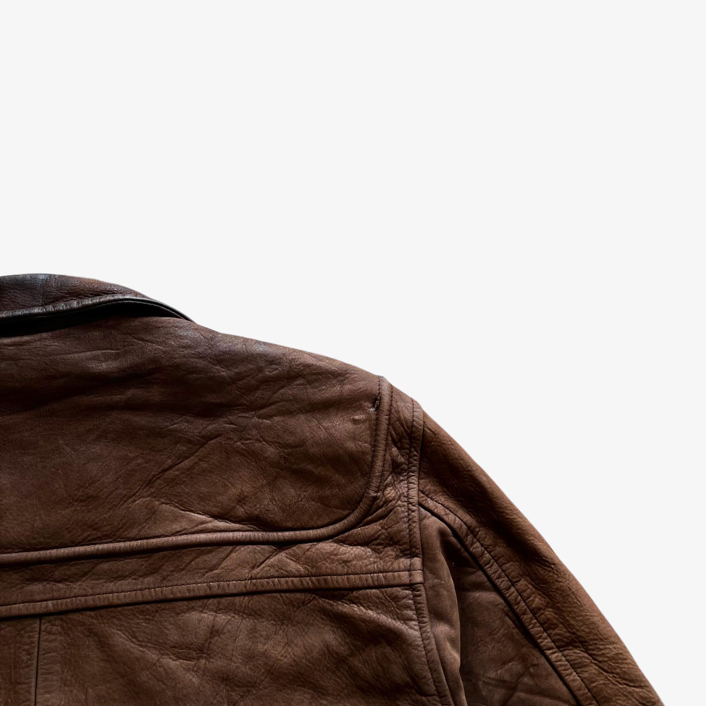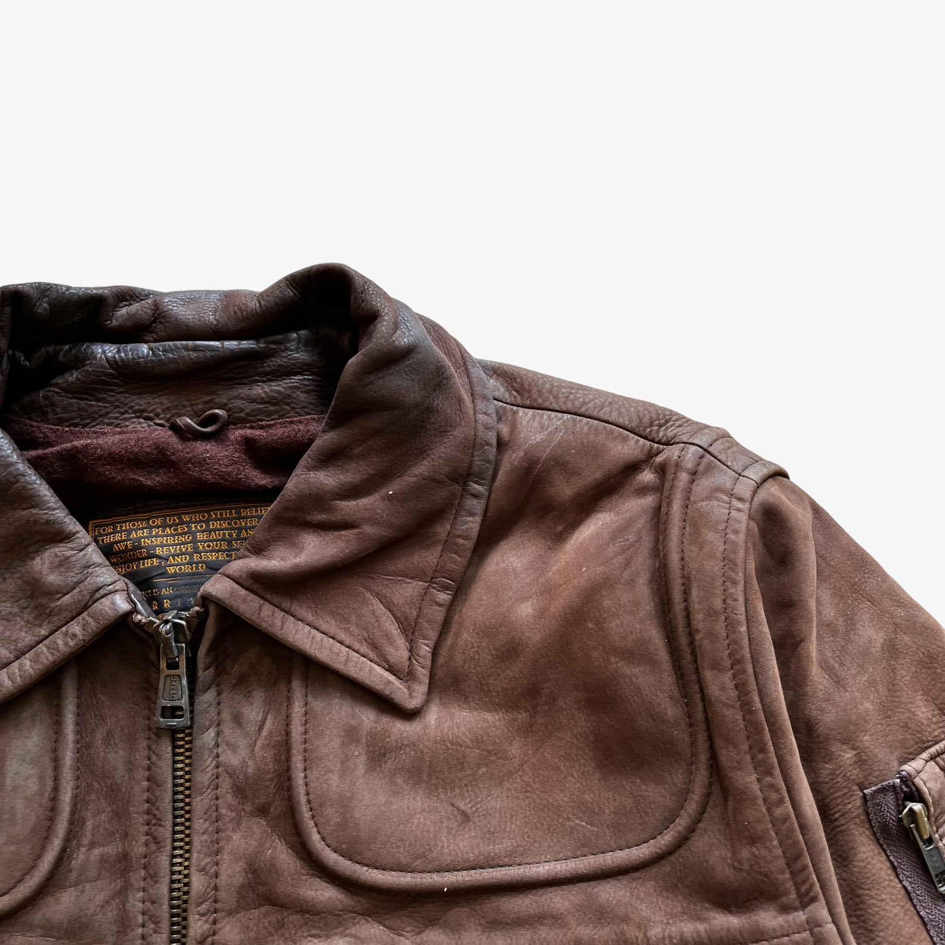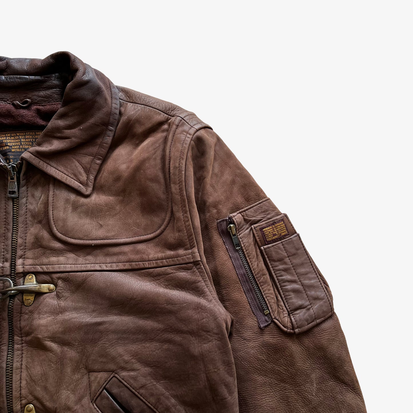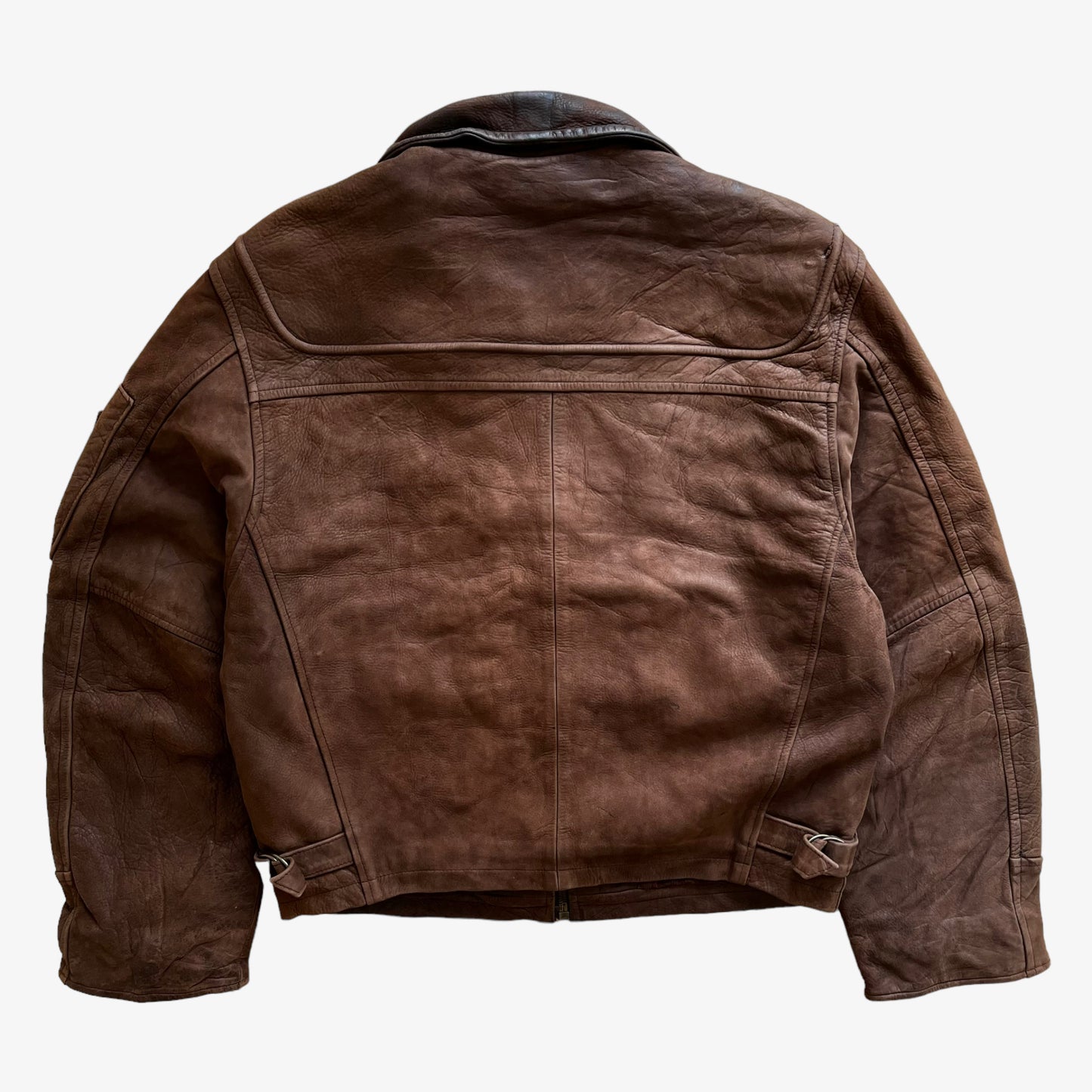 Vintage 90s Men's Redskins Territoire Brown Leather Pilot Jacket With Fish Hook Fasteners.