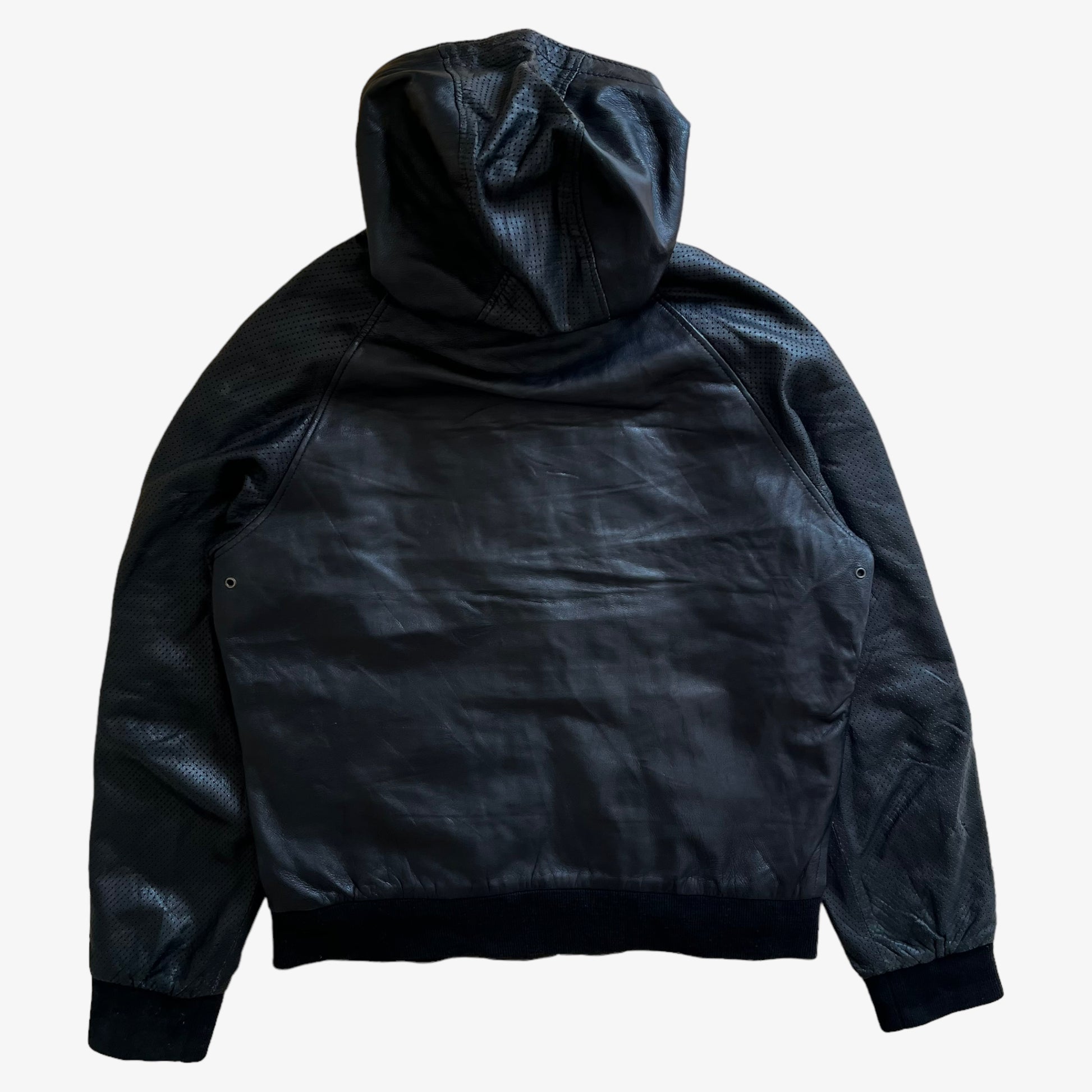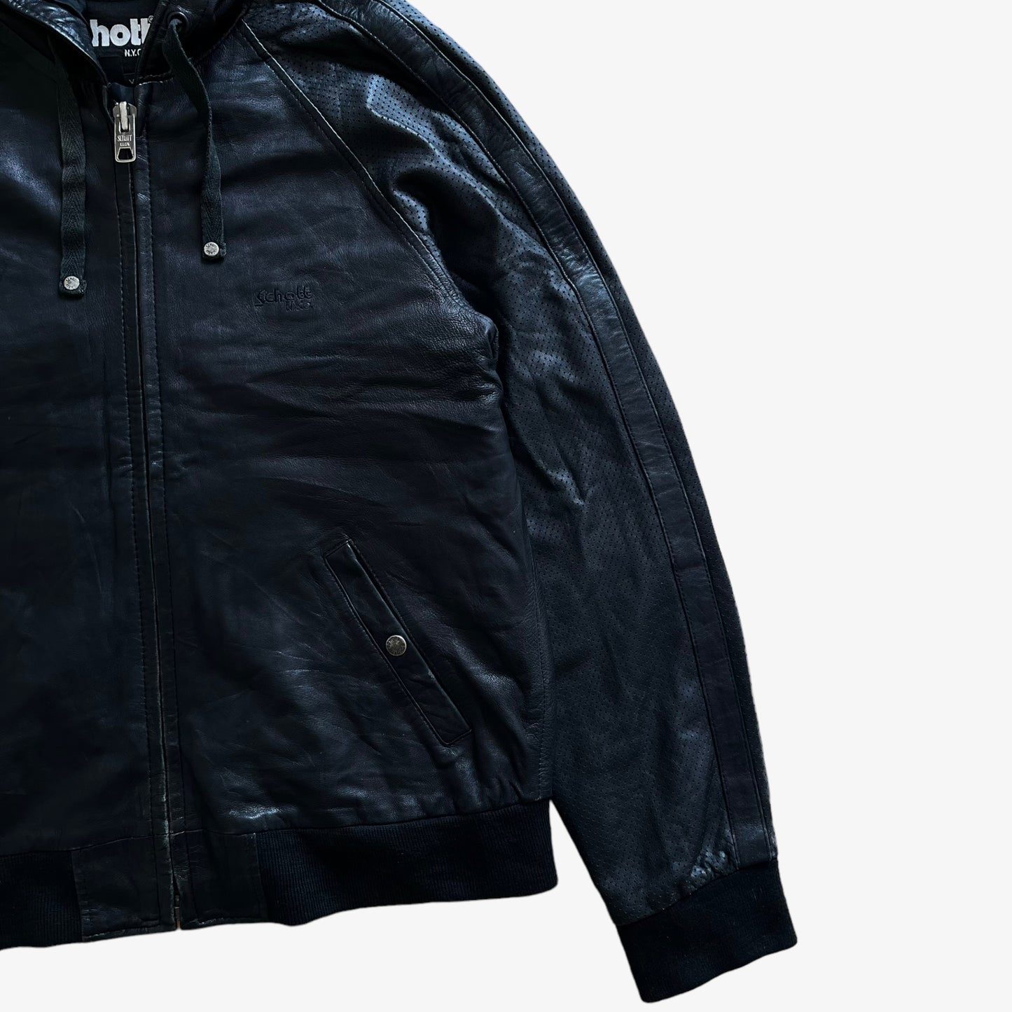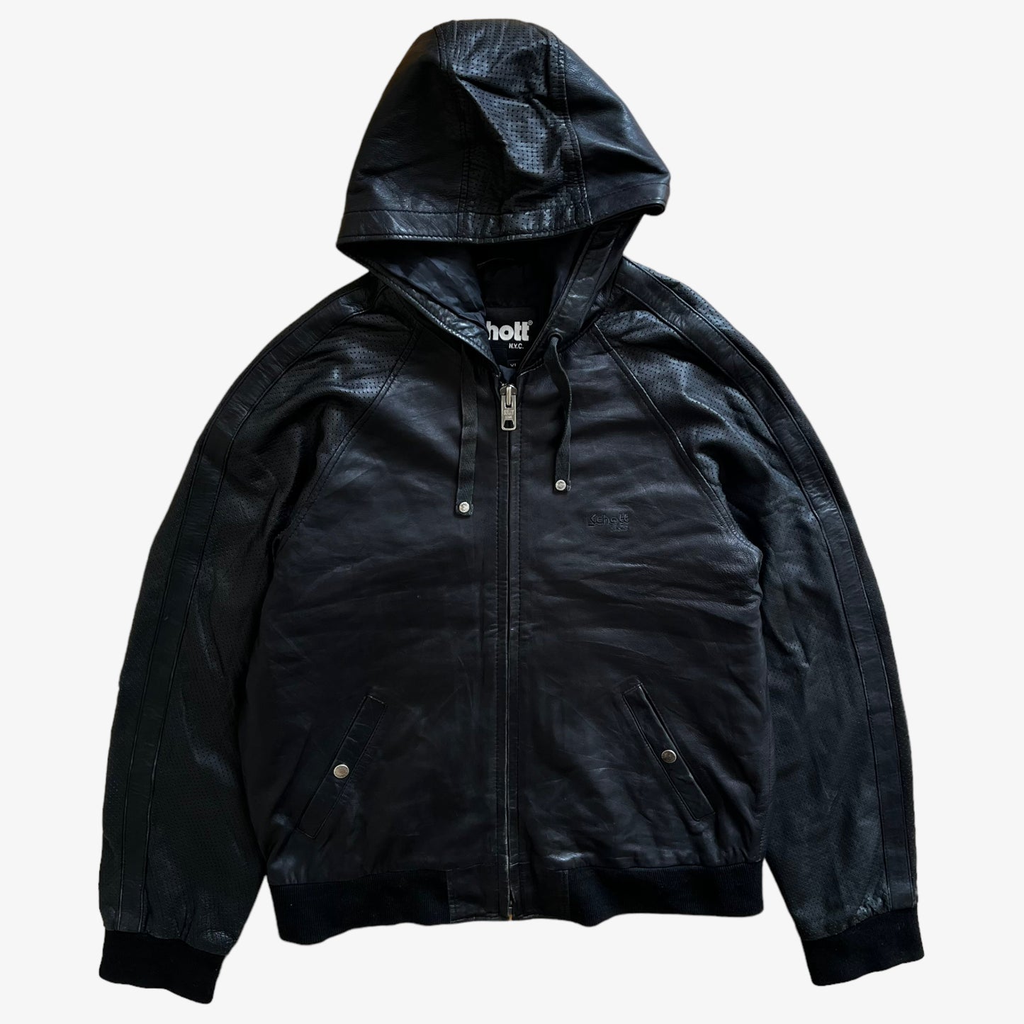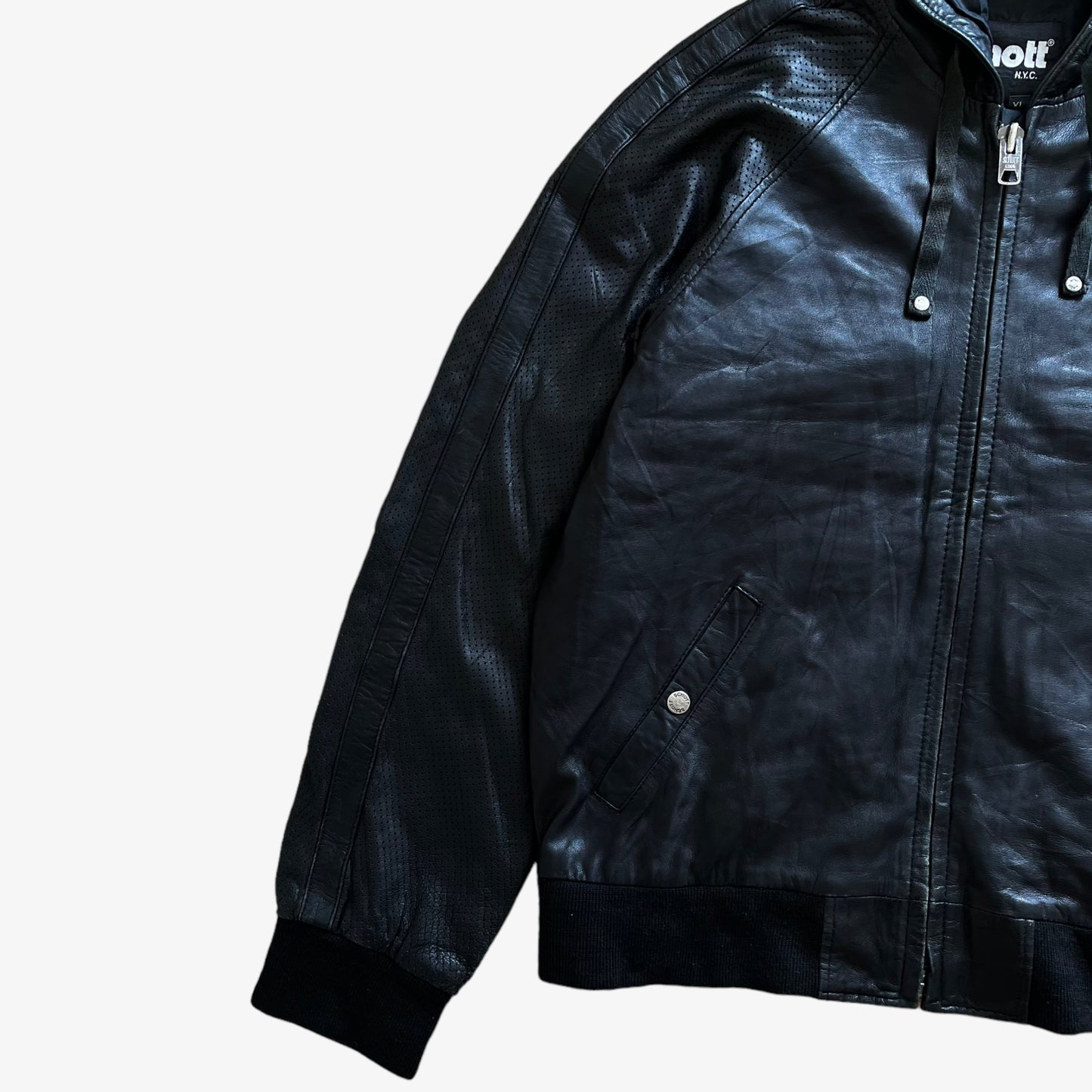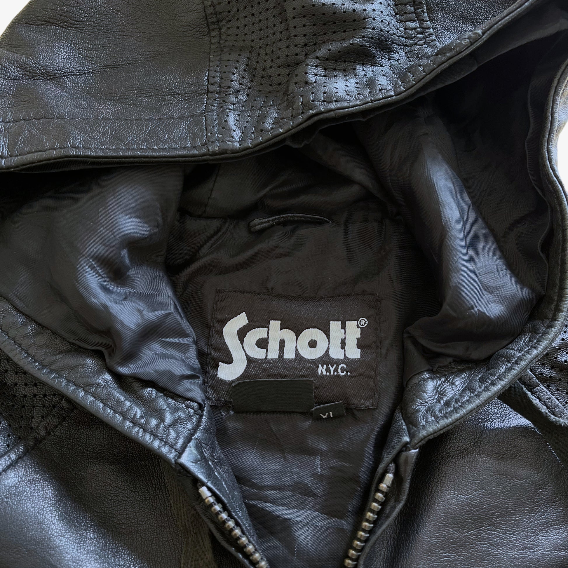 Vintage 90s Men's Schott Black Leather Hooded Jacket.