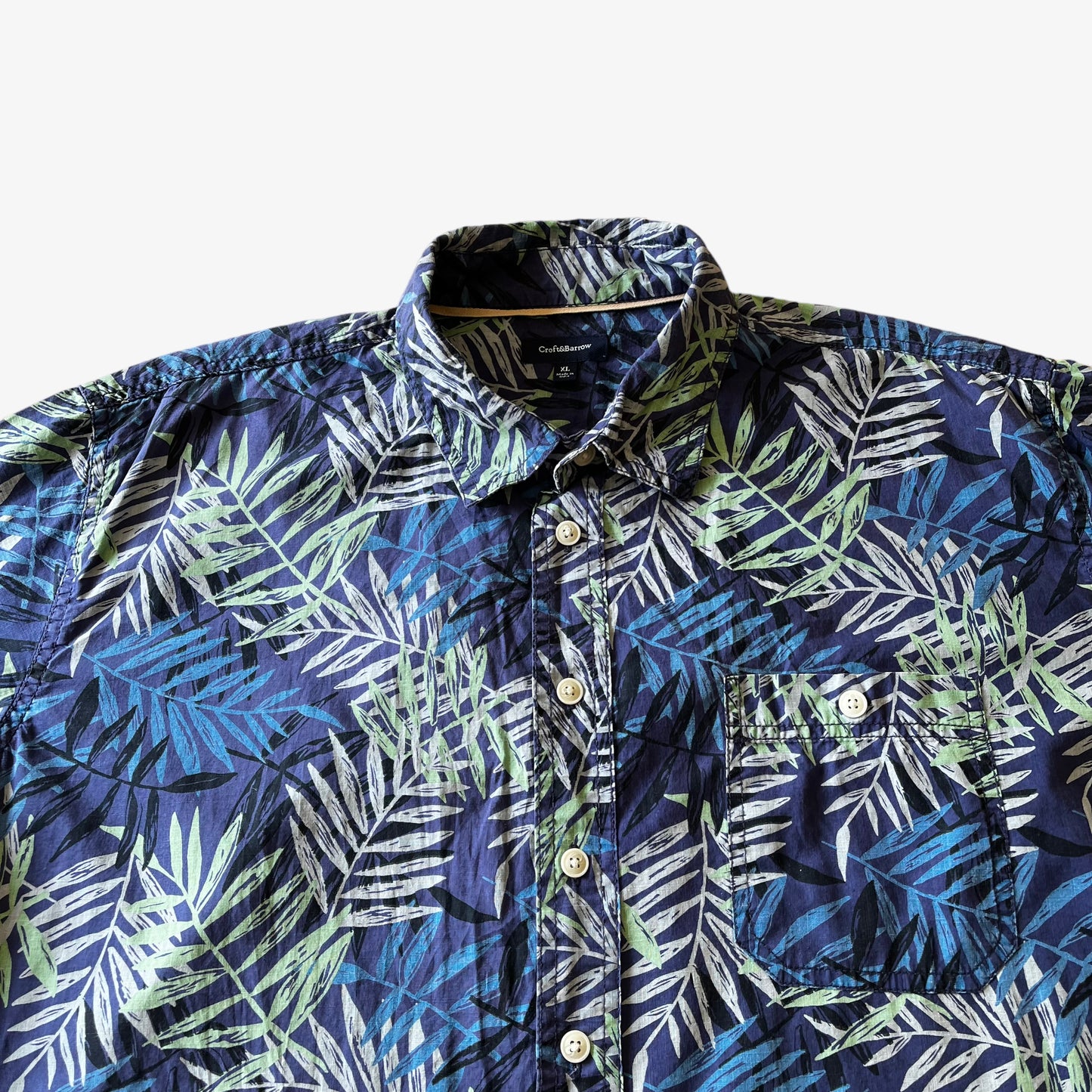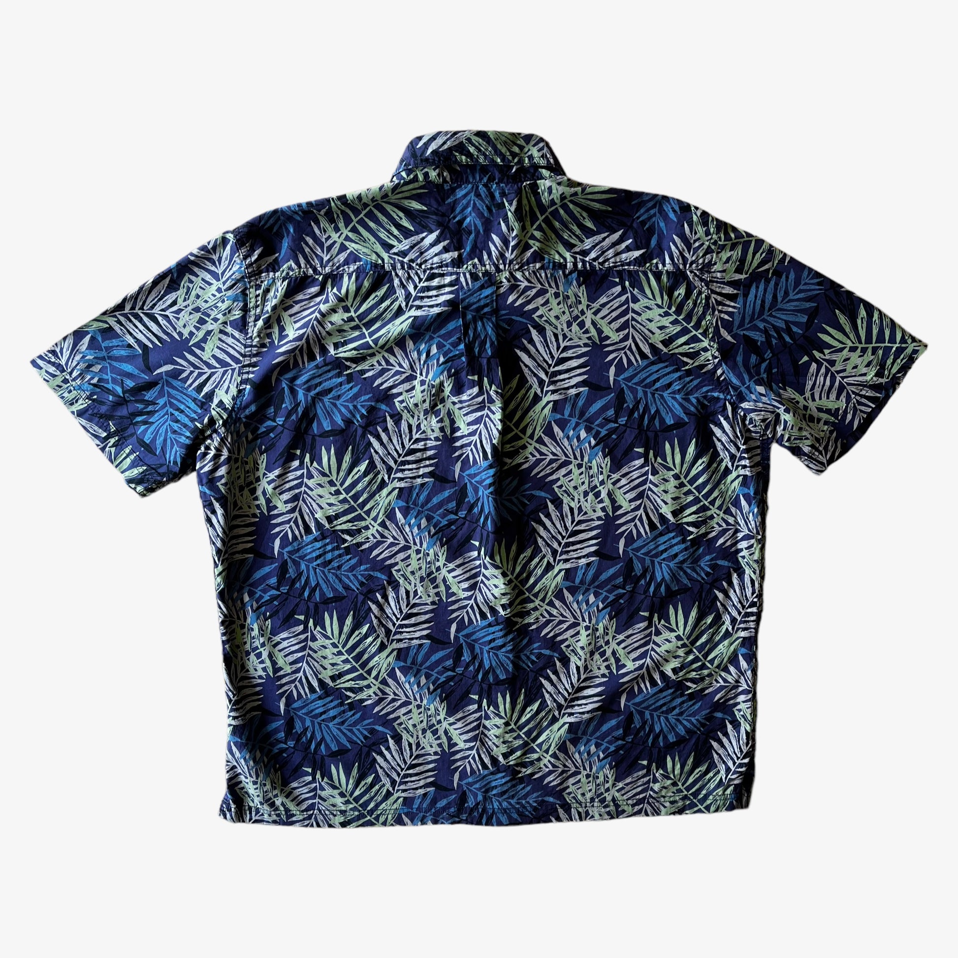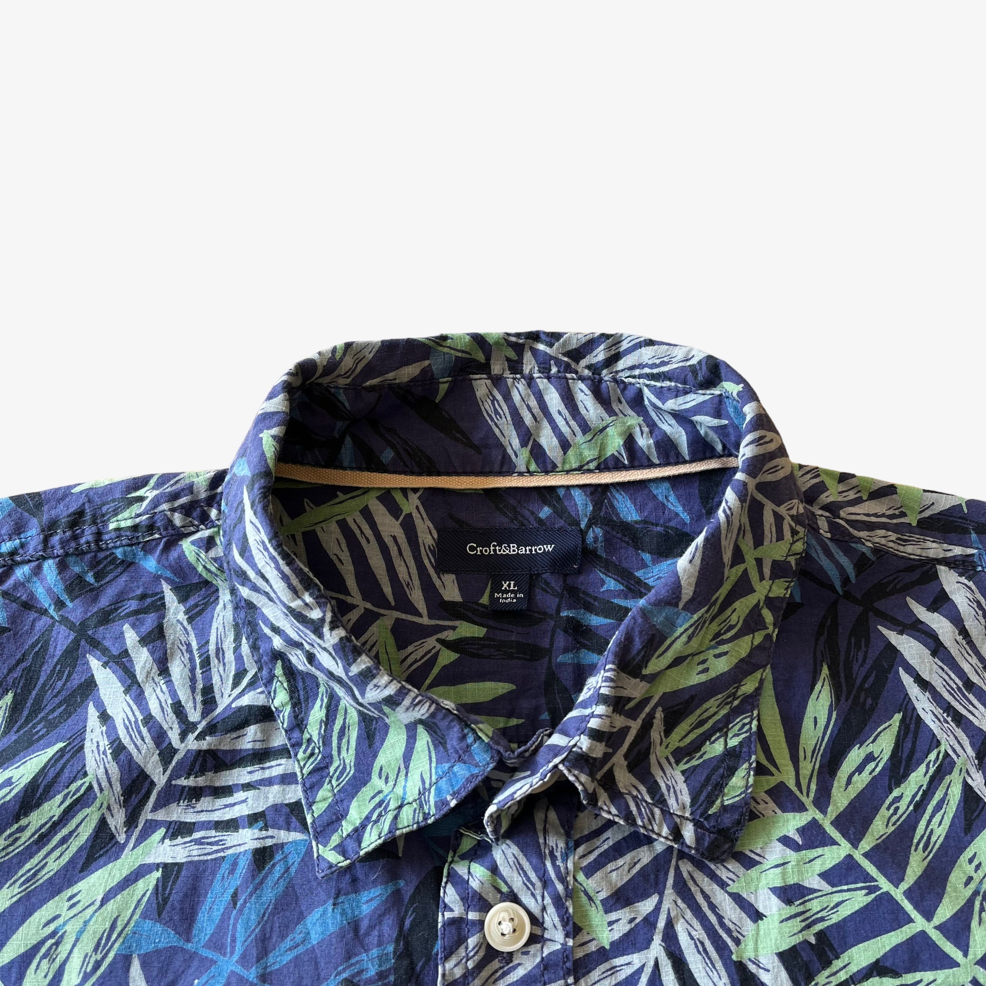 Vintage Y2K Men's Croft & Barrow Green Floral Print Blue Short Sleeve Hawaiian Shirt.