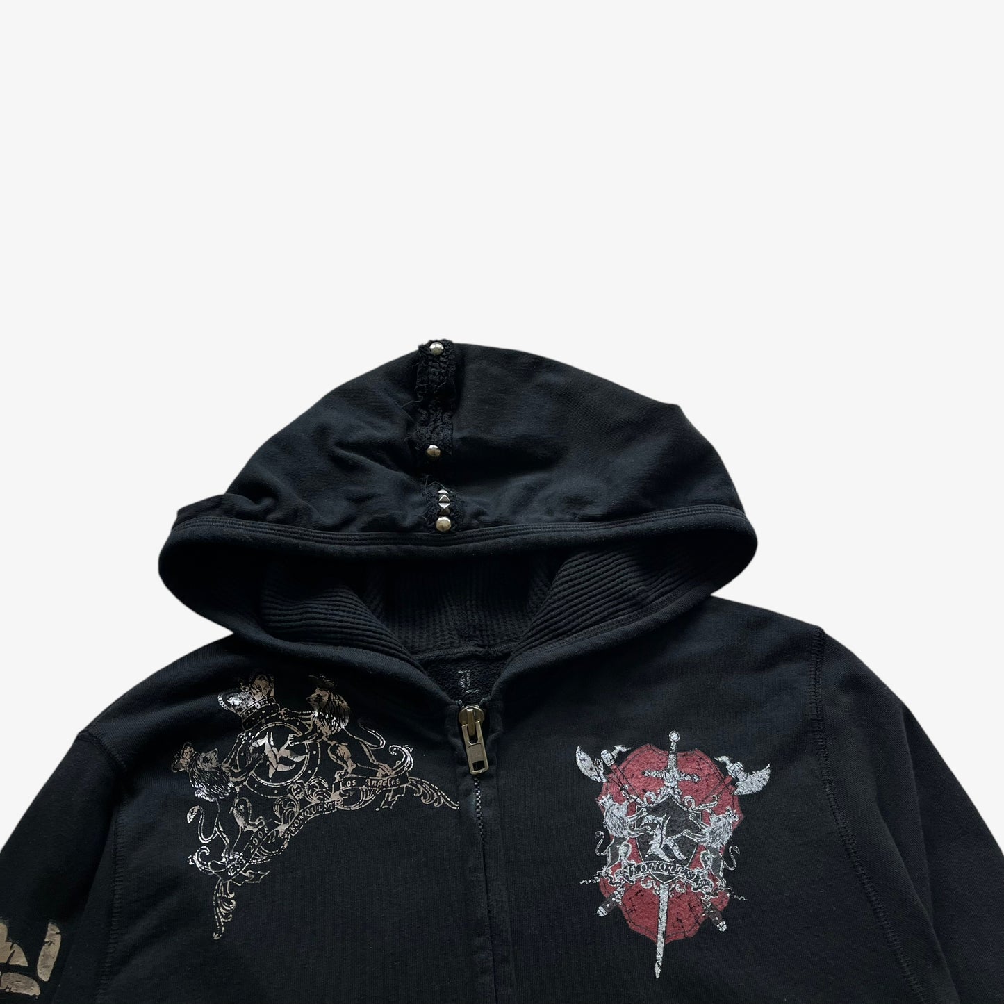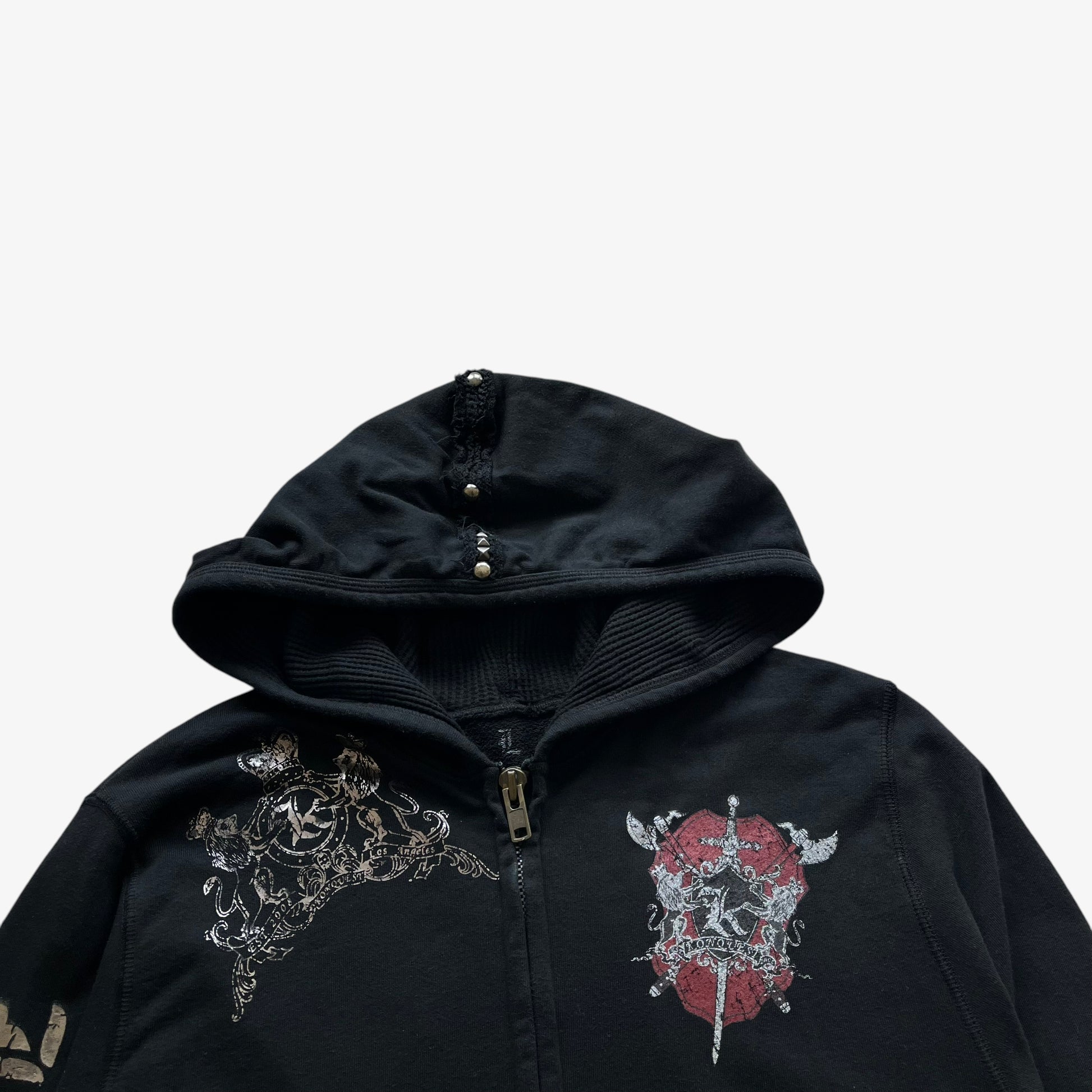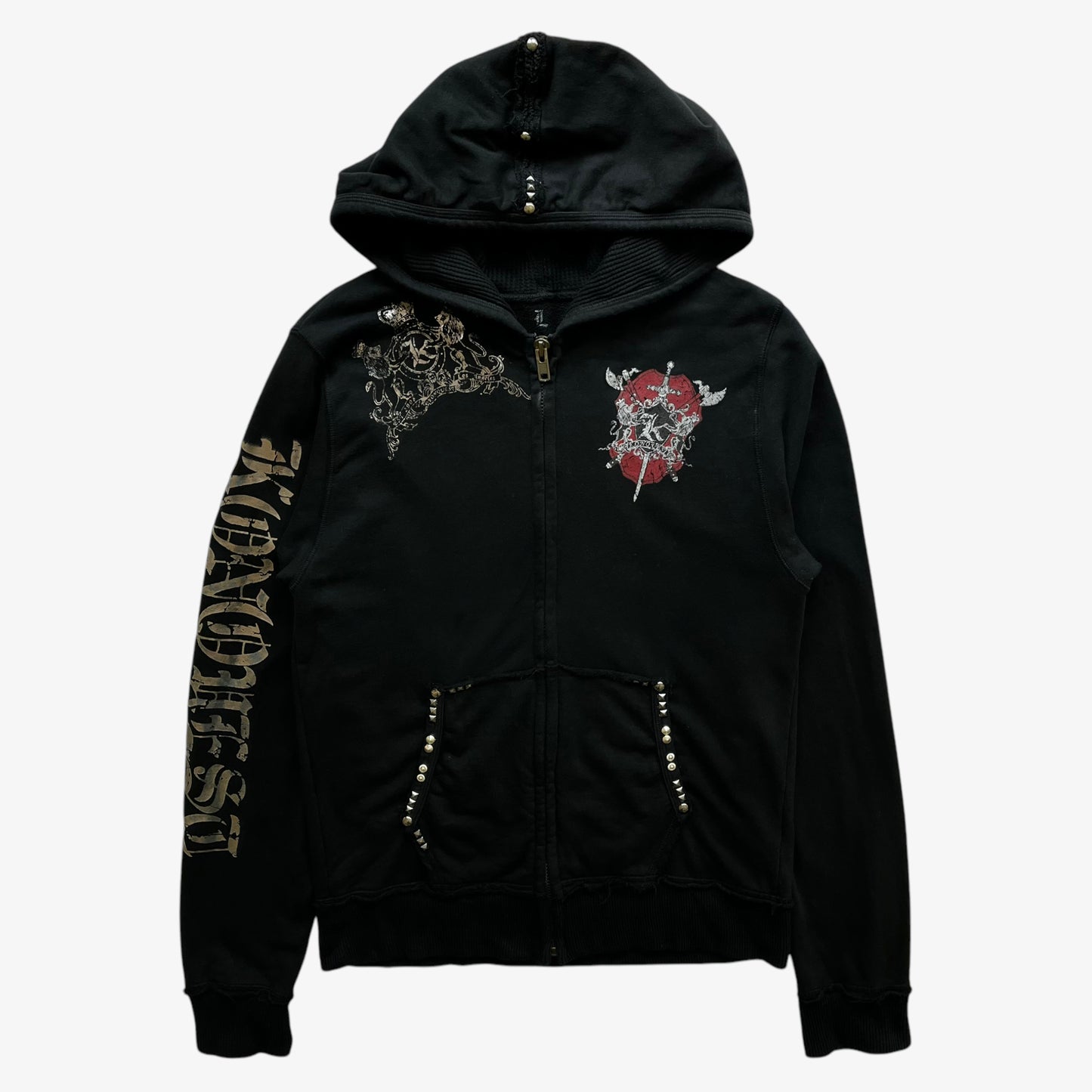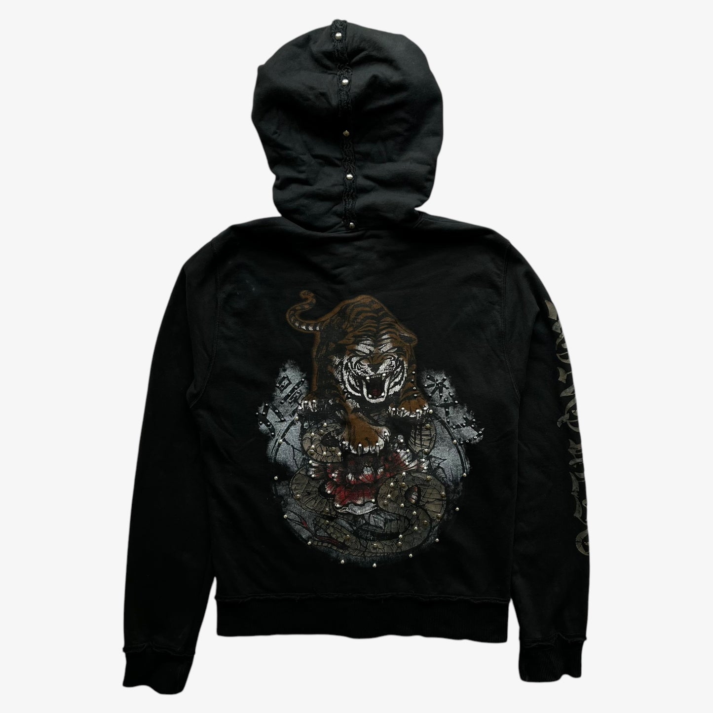 Vintage Y2K Men's Konquest Studded Tiger And Snake Double Sided Print Black Hooded Jacket.
