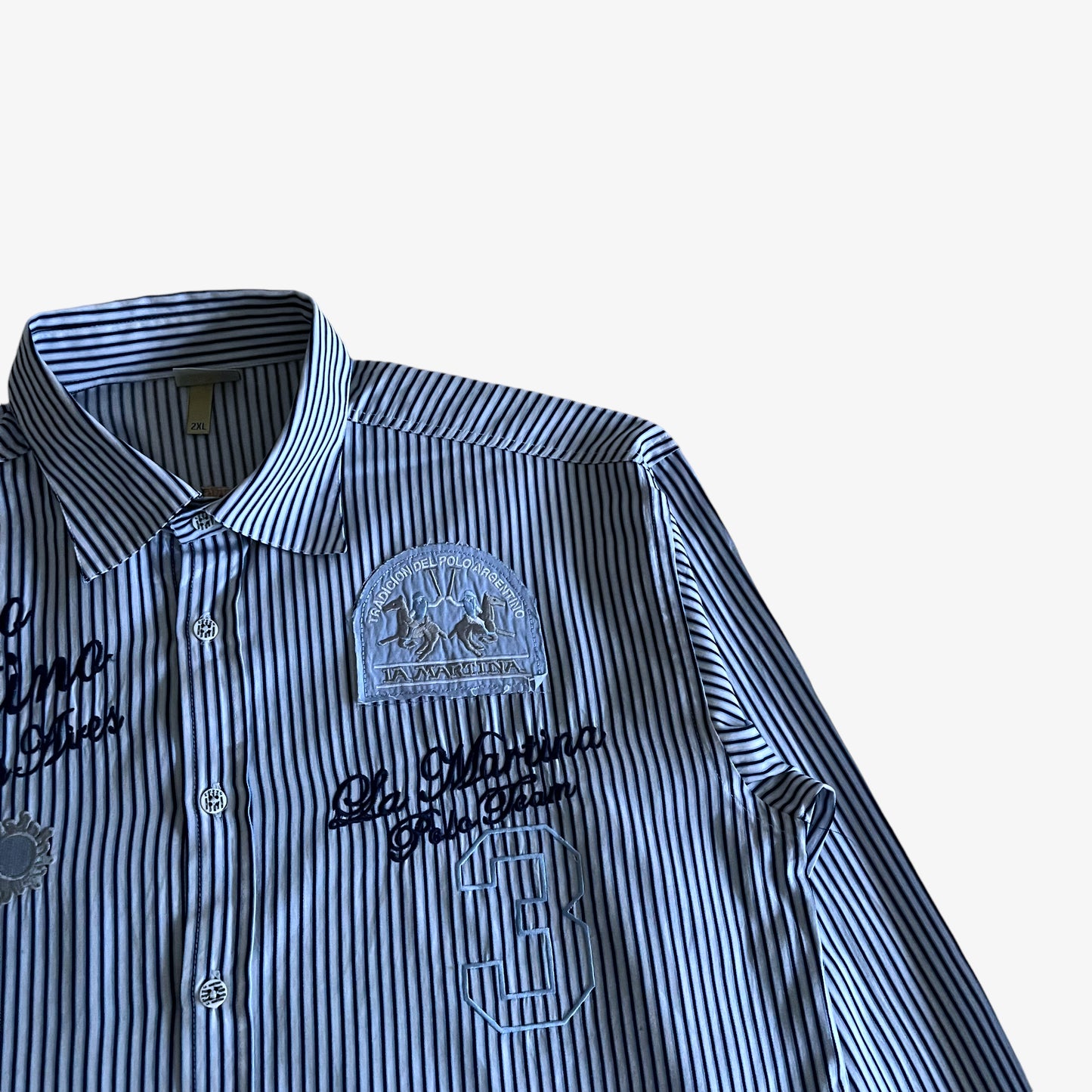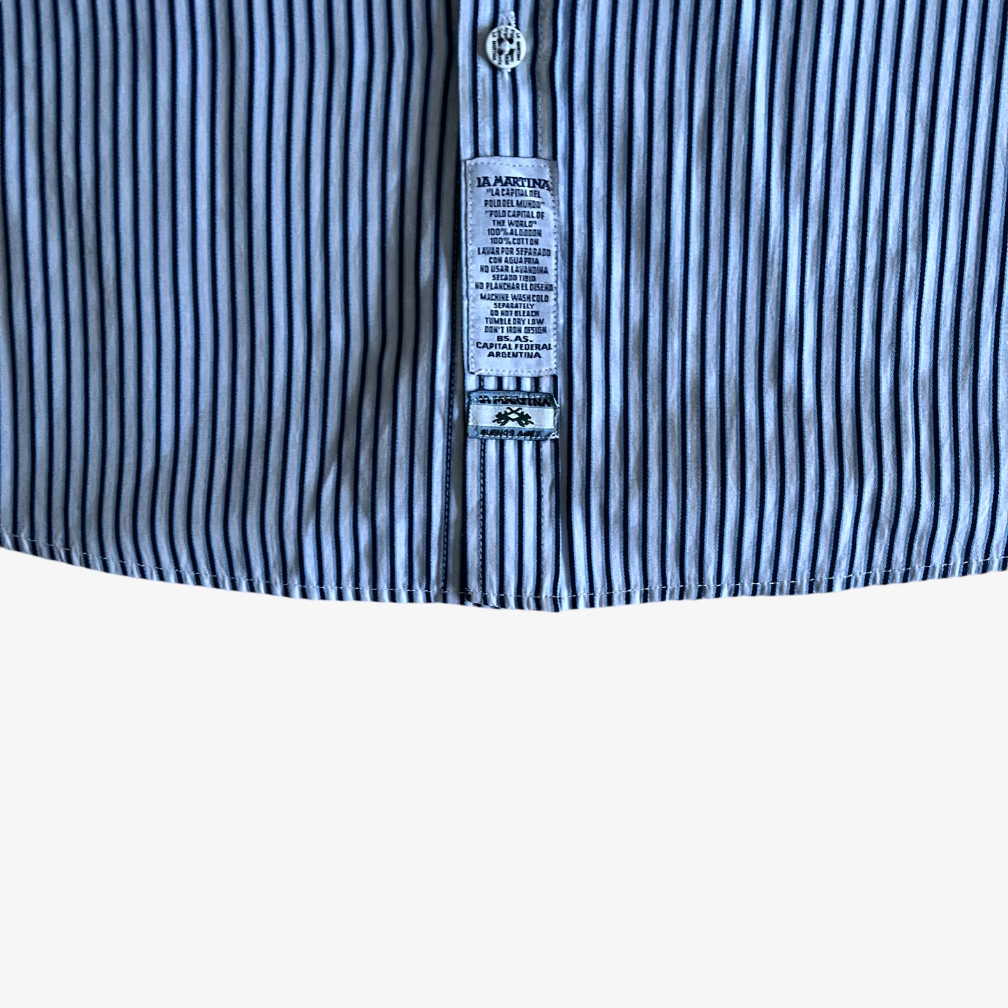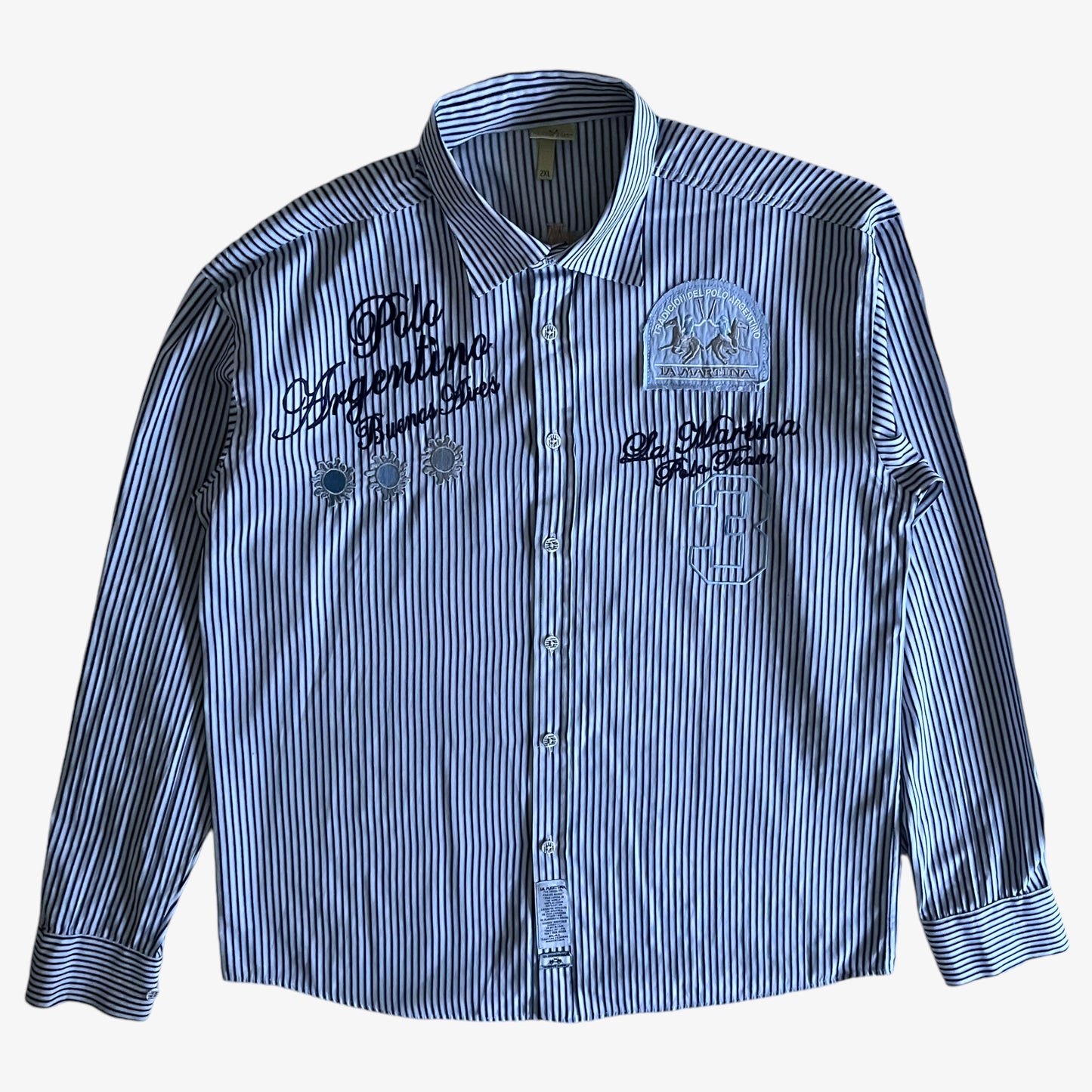 Vintage Y2K Men's La Martina Argentina Polo Team Blue And White Striped Shirt.