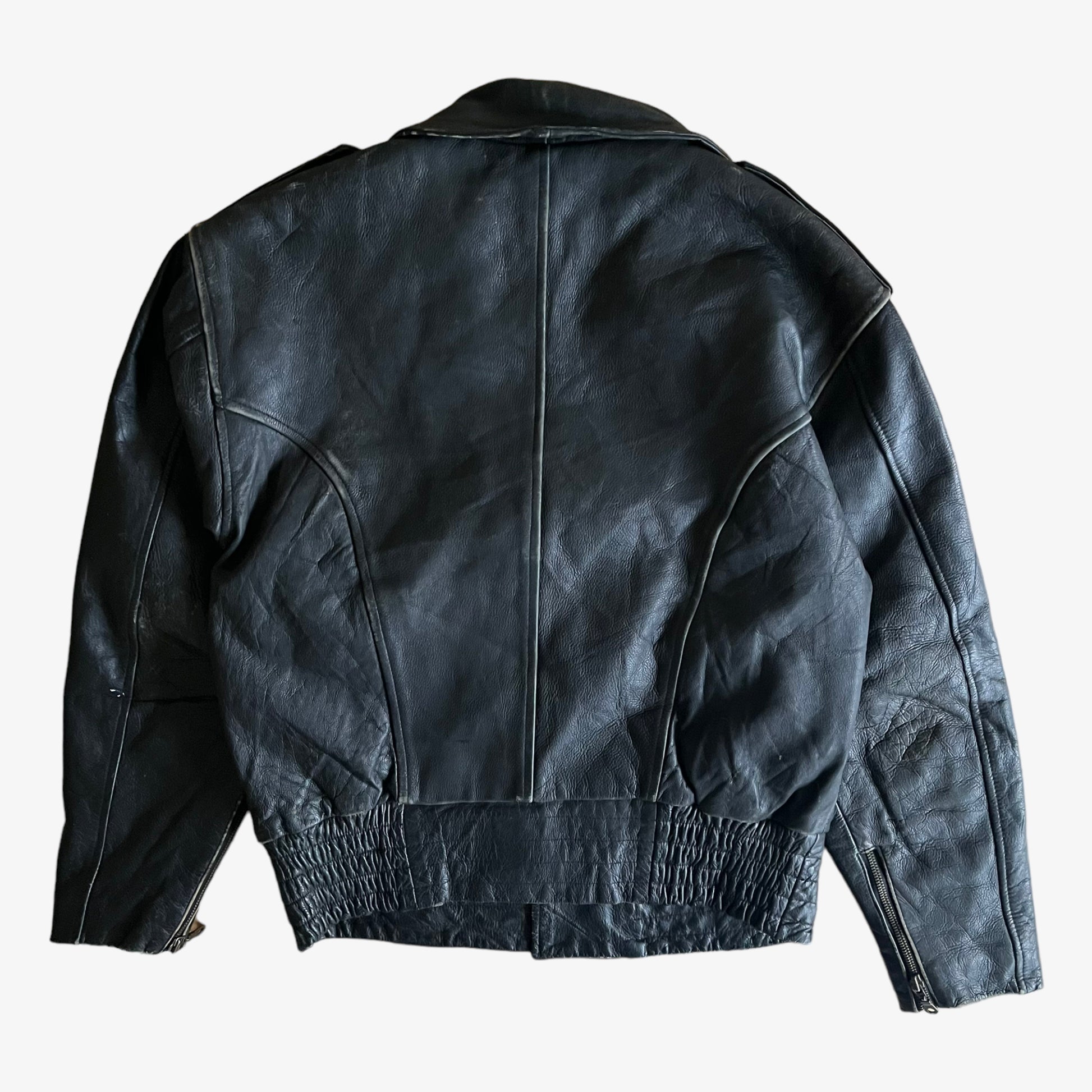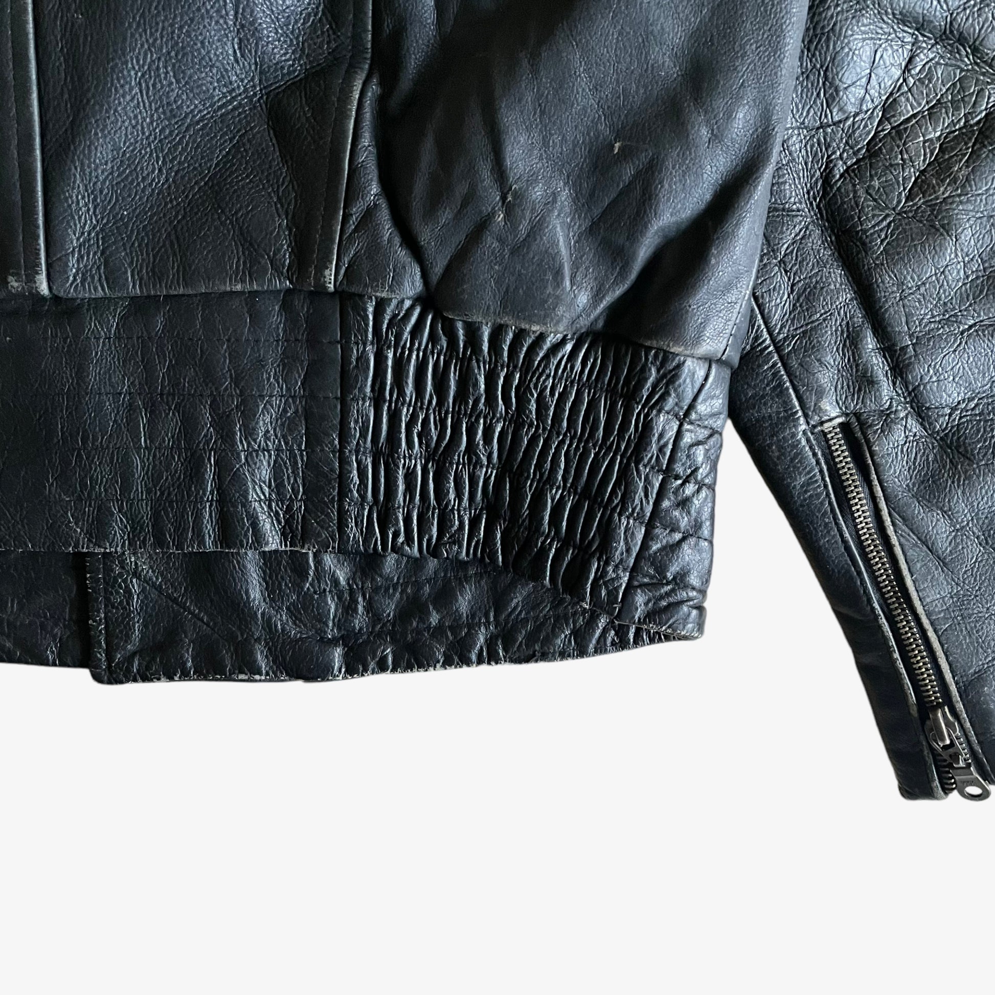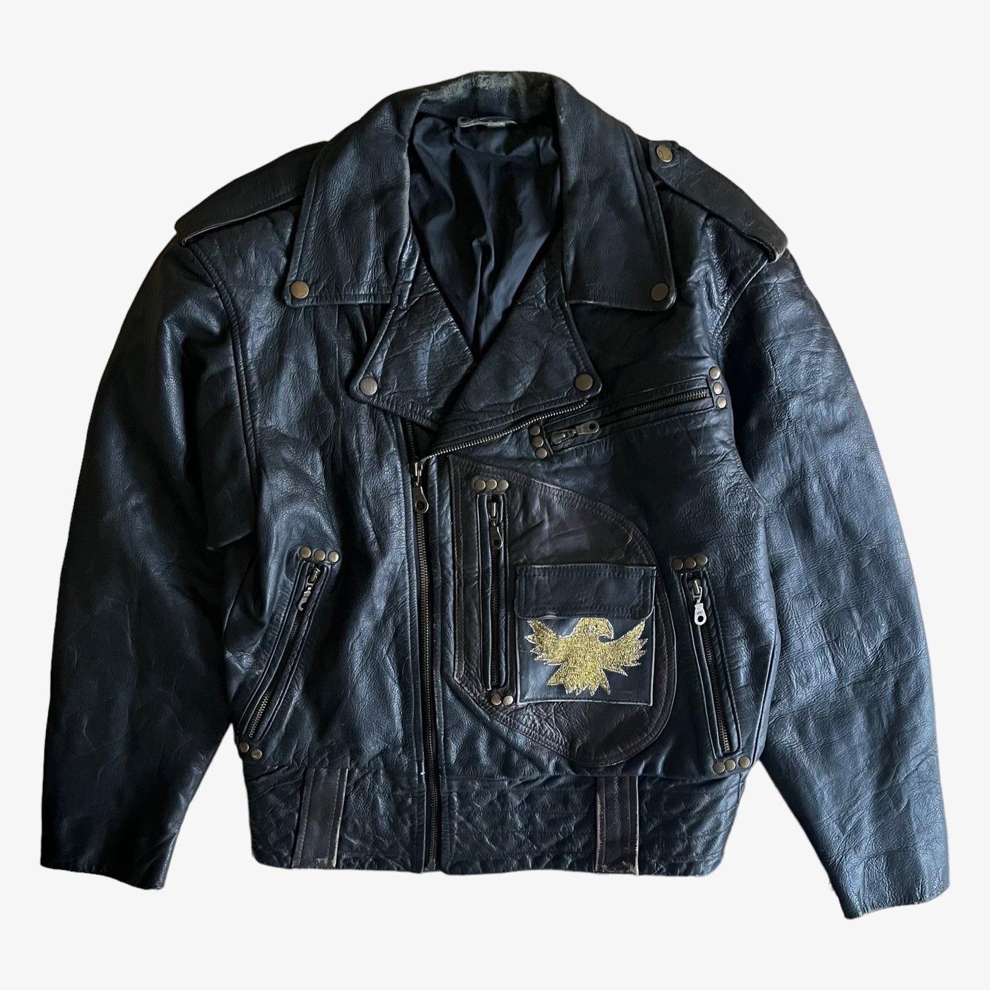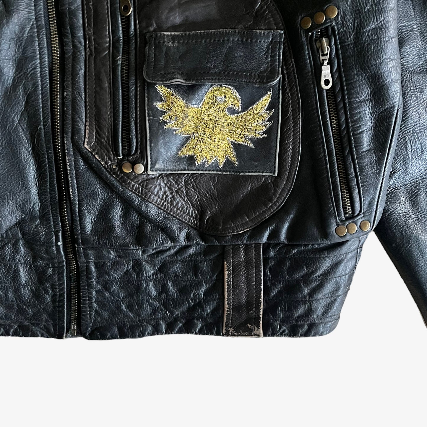 Vintage 90s Men's Black Leather Biker Jacket Featuring An Embroidered Eagle.