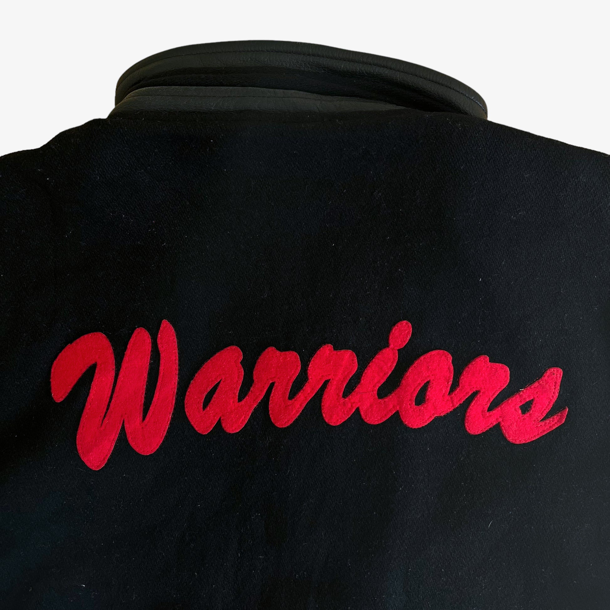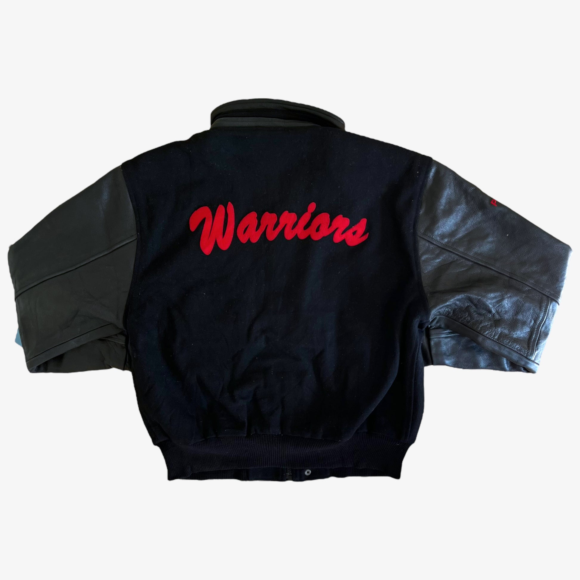 Vintage 90s Men's Warriors Black Leather Varsity Jacket Featuring A Back Embroidered Spell Out.