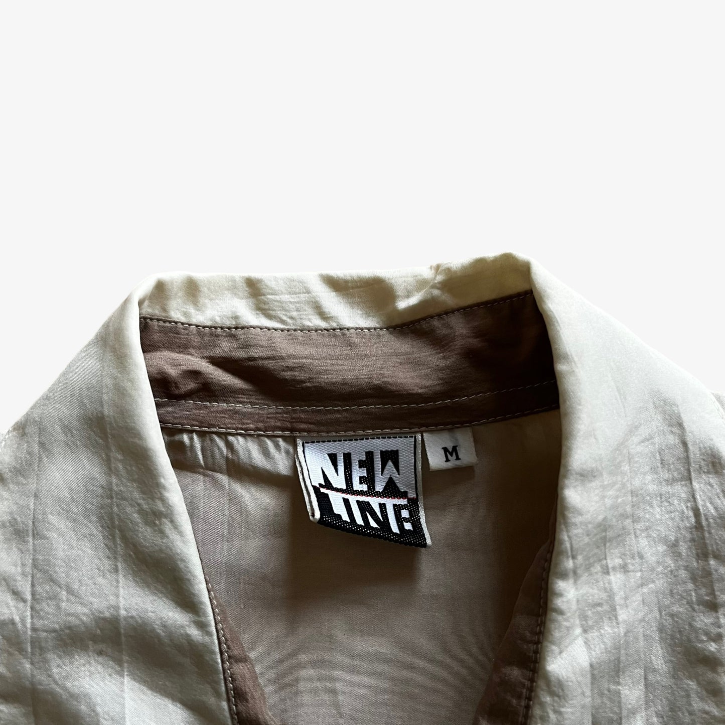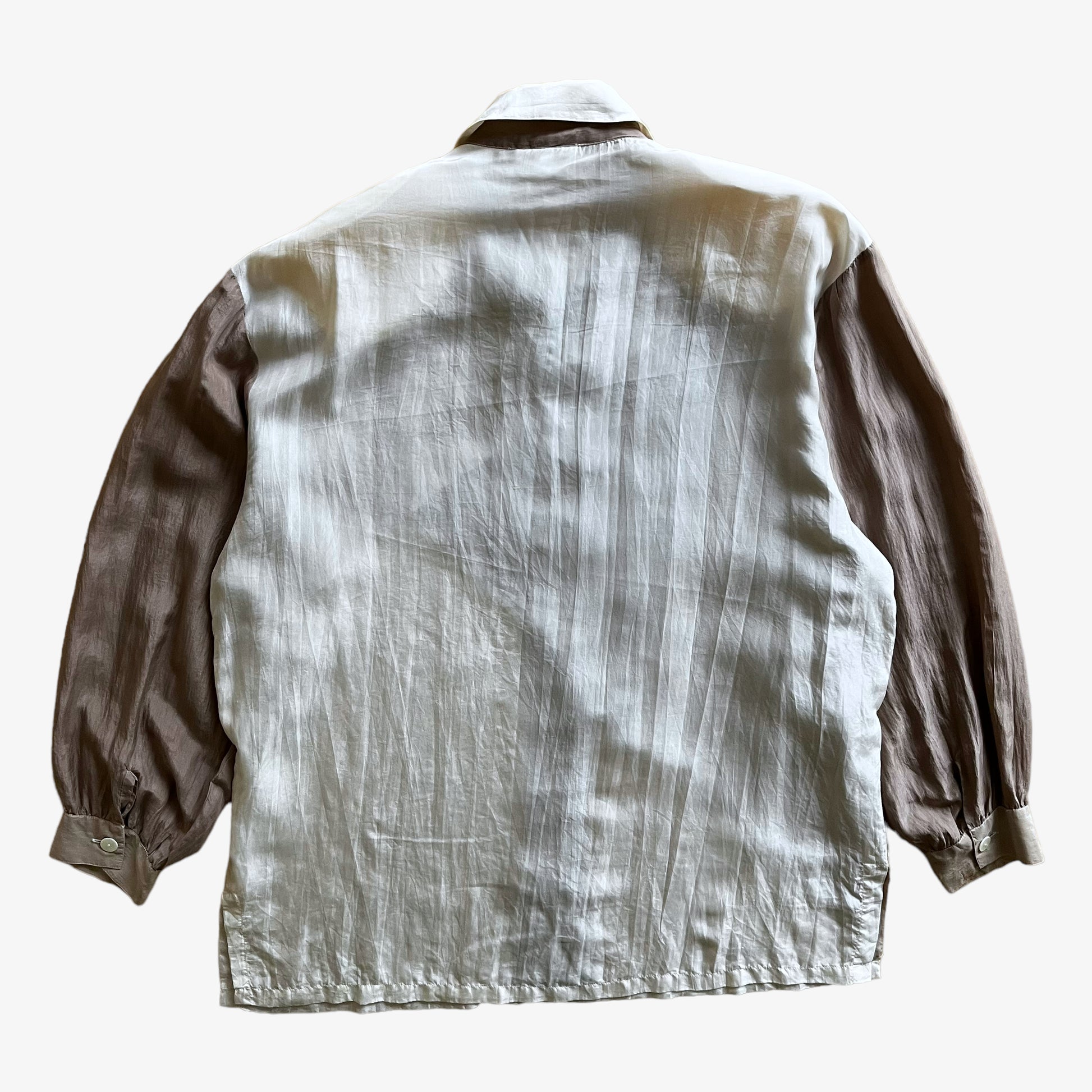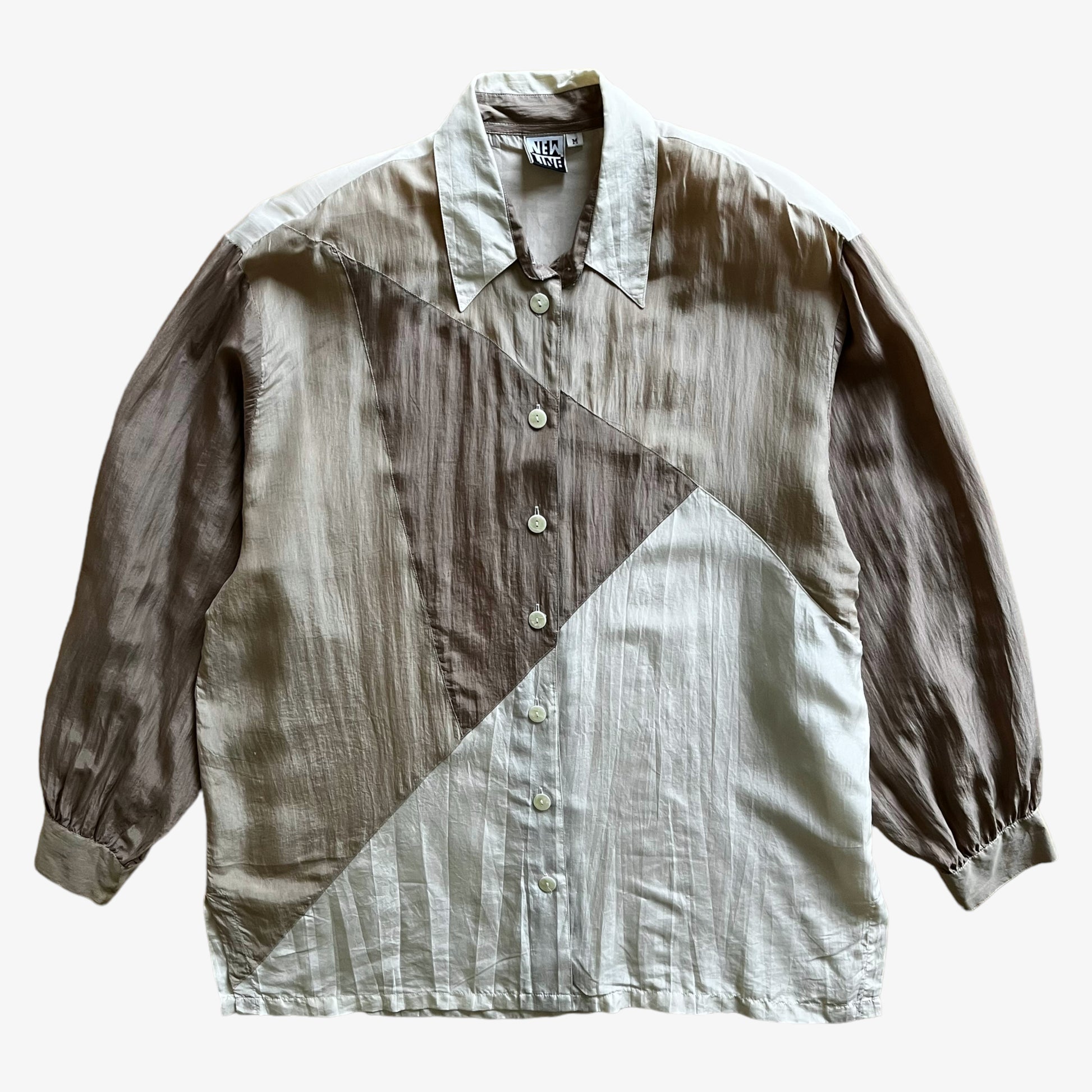 Vintage 80s Women's New Line Beige & White Abstract Print Long Sleeve Silk Shirt With Shoulder Pads.