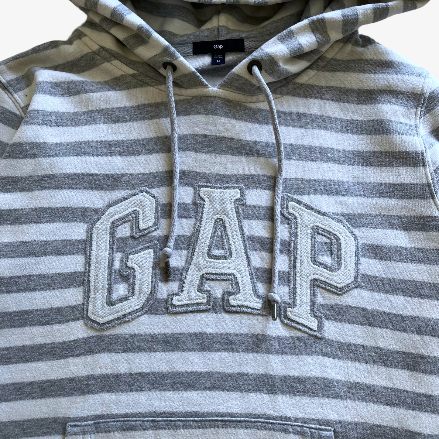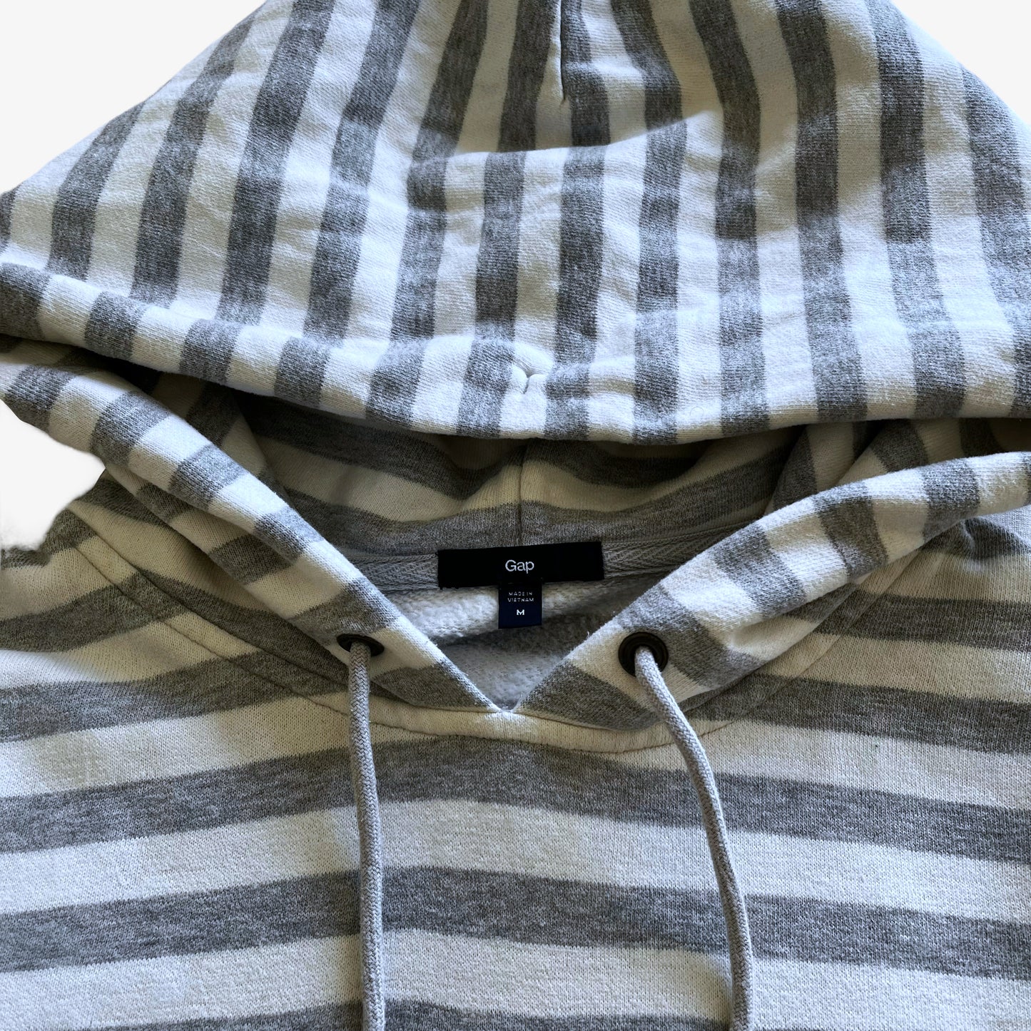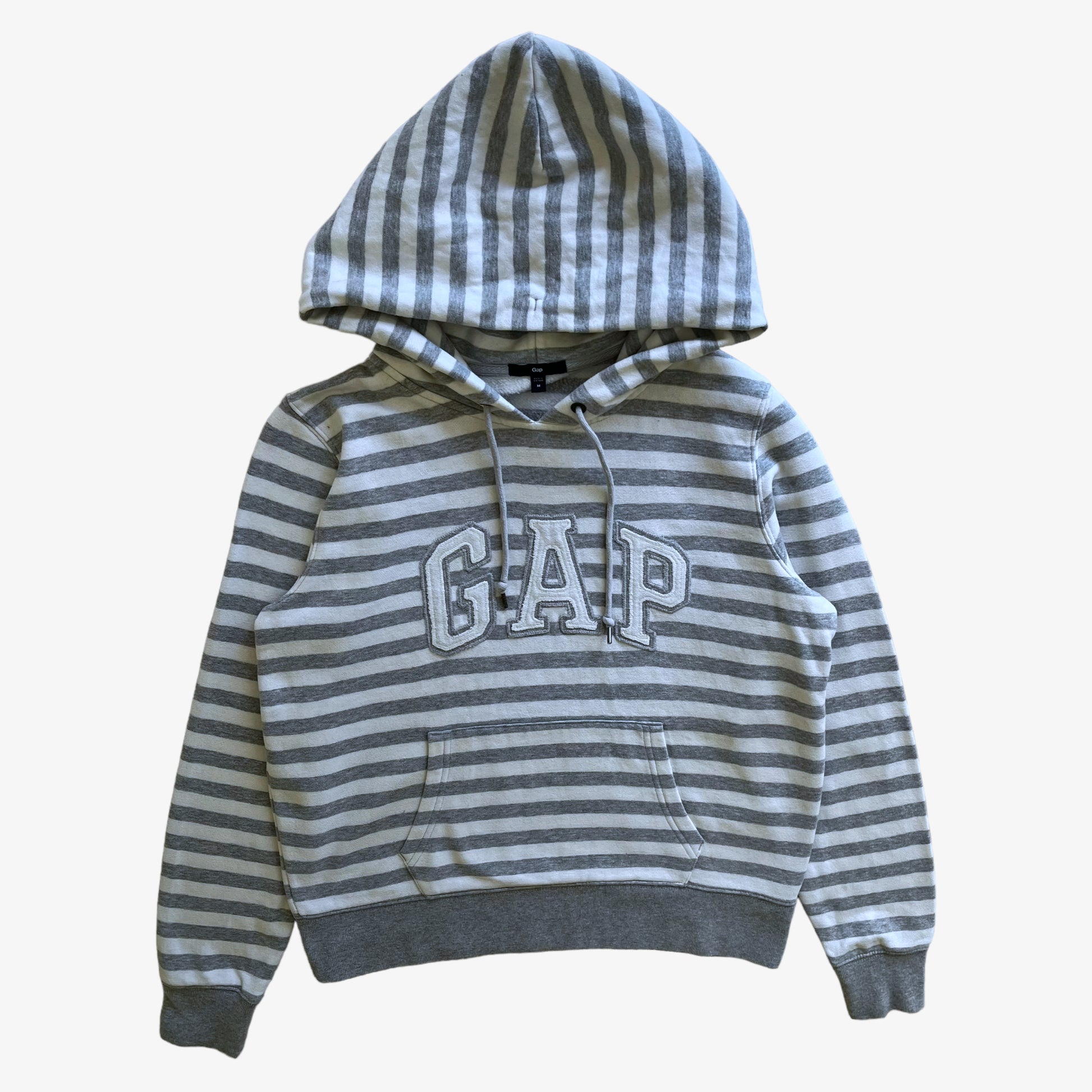 Vintage Y2K Women's GAP White And Grey Striped Spell Out Hoodie.